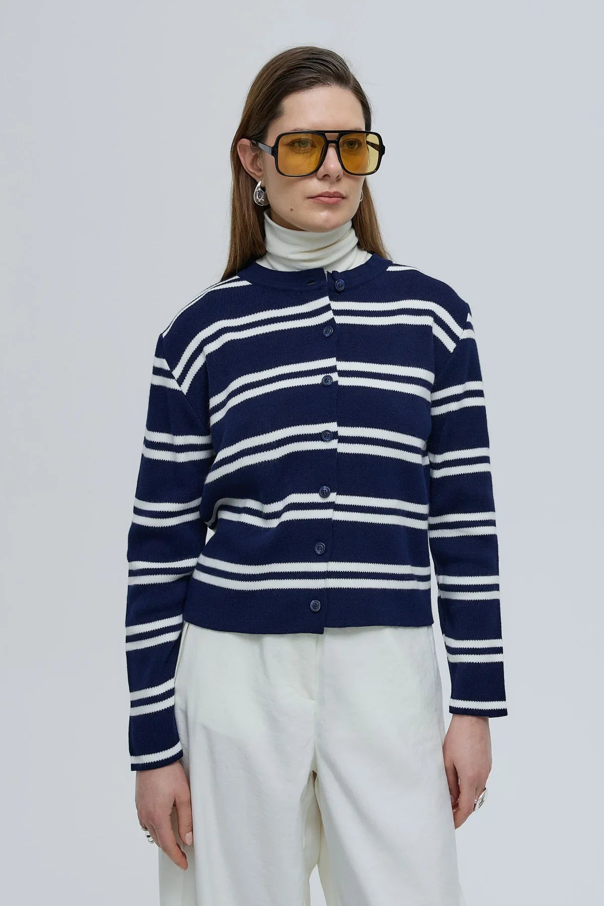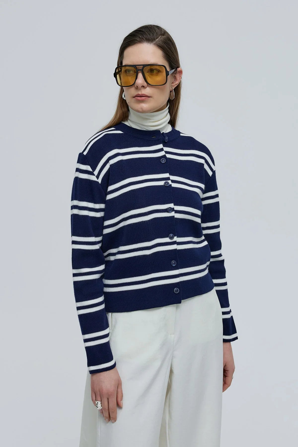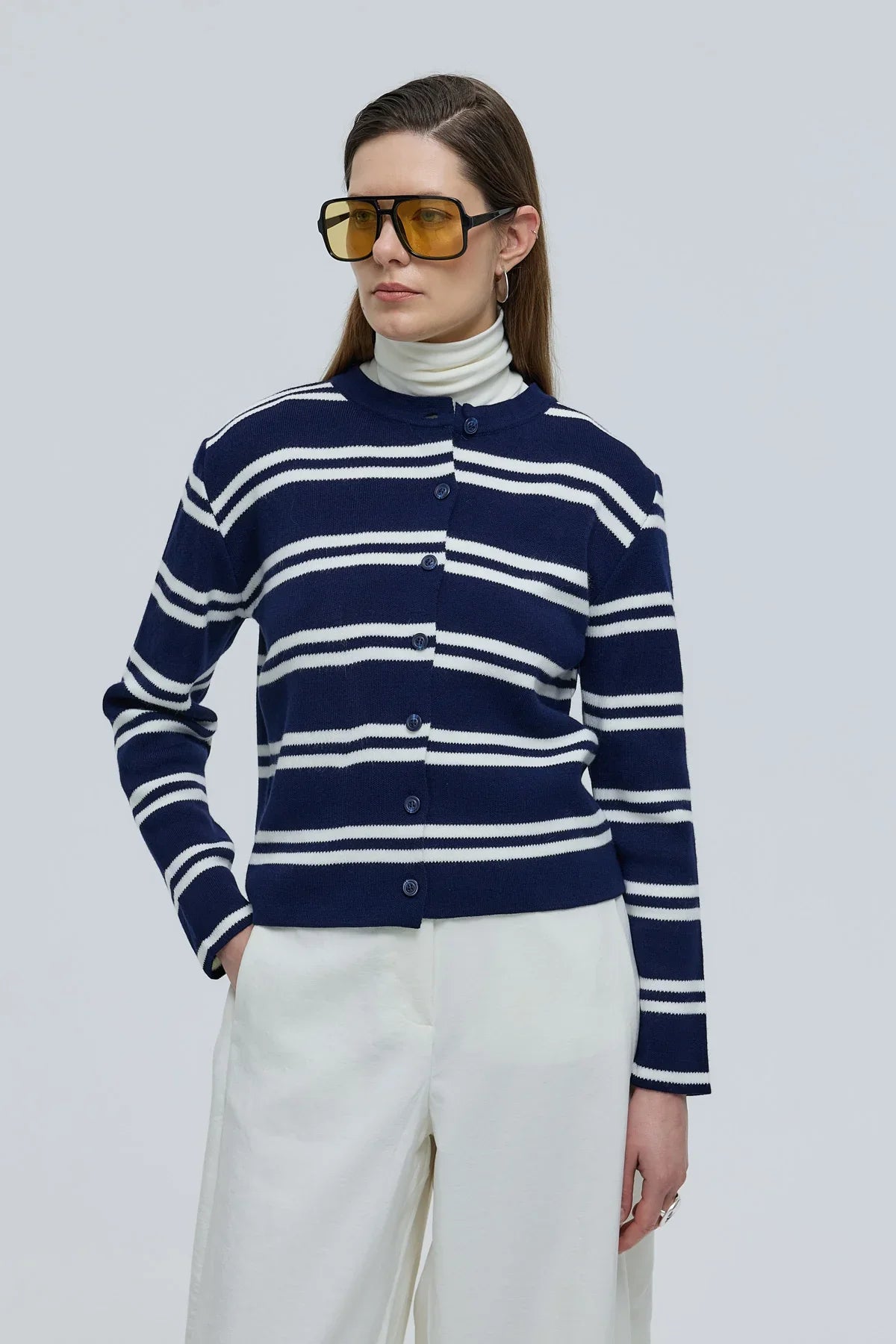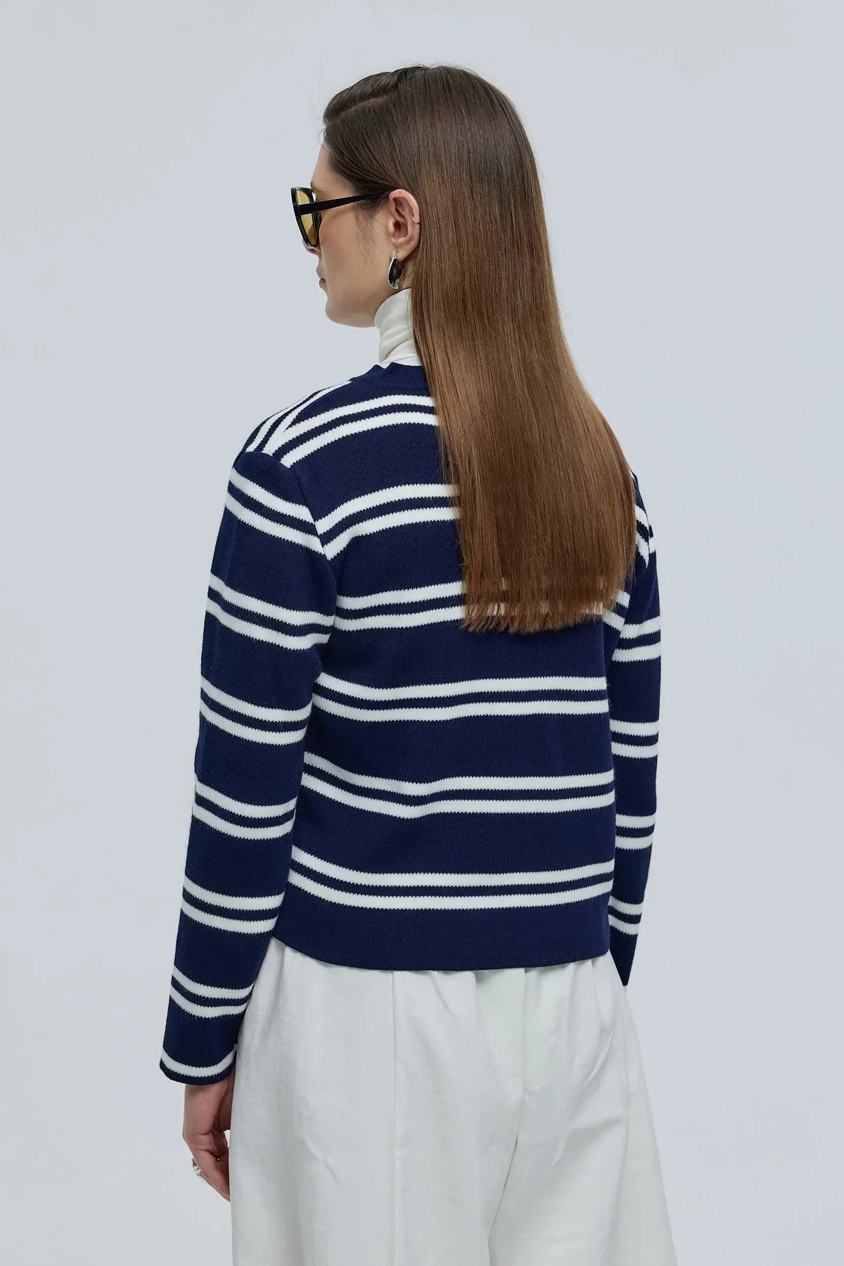 Çizgili Basic Düğmeli Triko Hırka Lacivert
