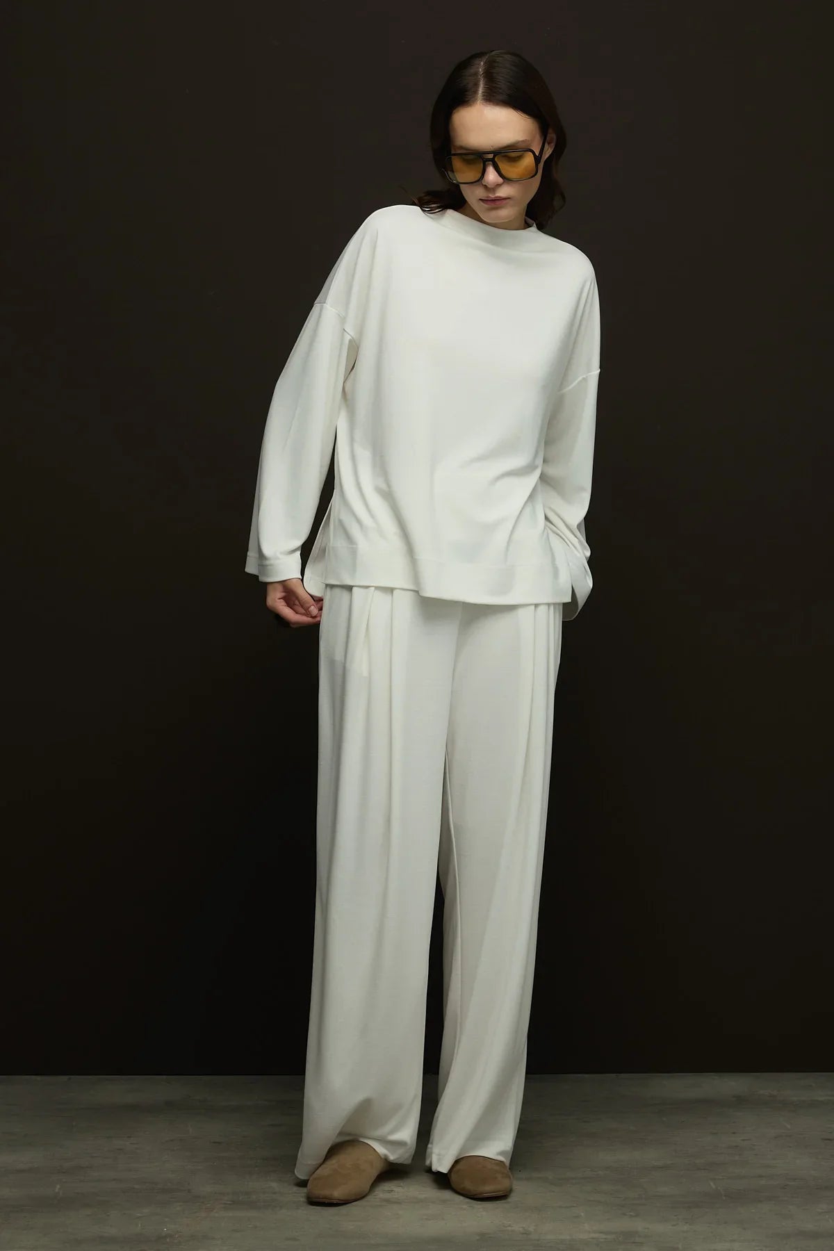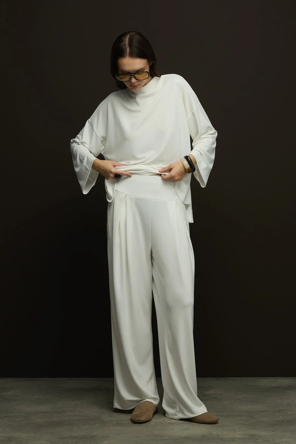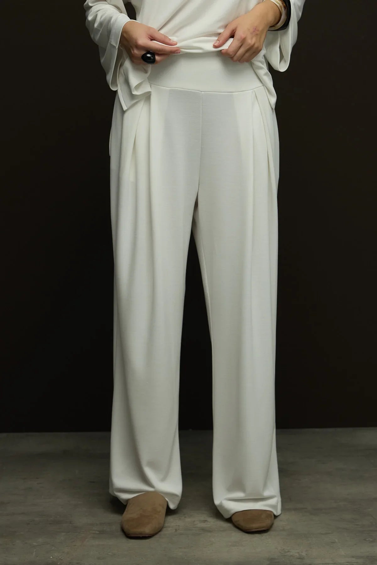 Yumuşak dokusu ve zarif duruşuyla öne çıkan bu pantolon,modal kumaşı sayesinde nefes alabilirlik ve gün boyu konfor sunar. Önden pili detayları rahatlık katarken,bel kemeri vücuda oturması korse görünümü verir.