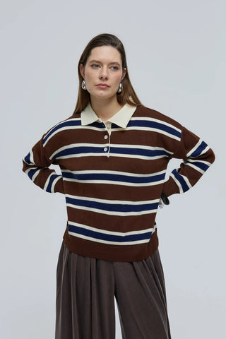 Polo Yaka Çizgili Triko Kazak Kahverengi
