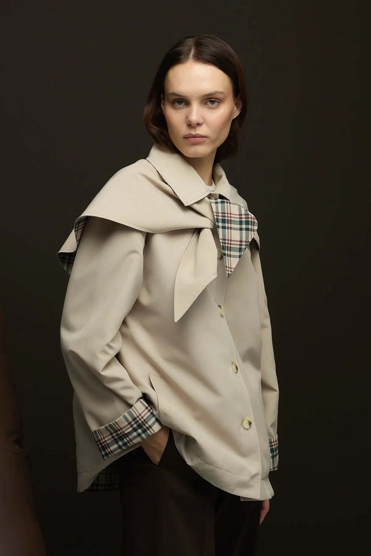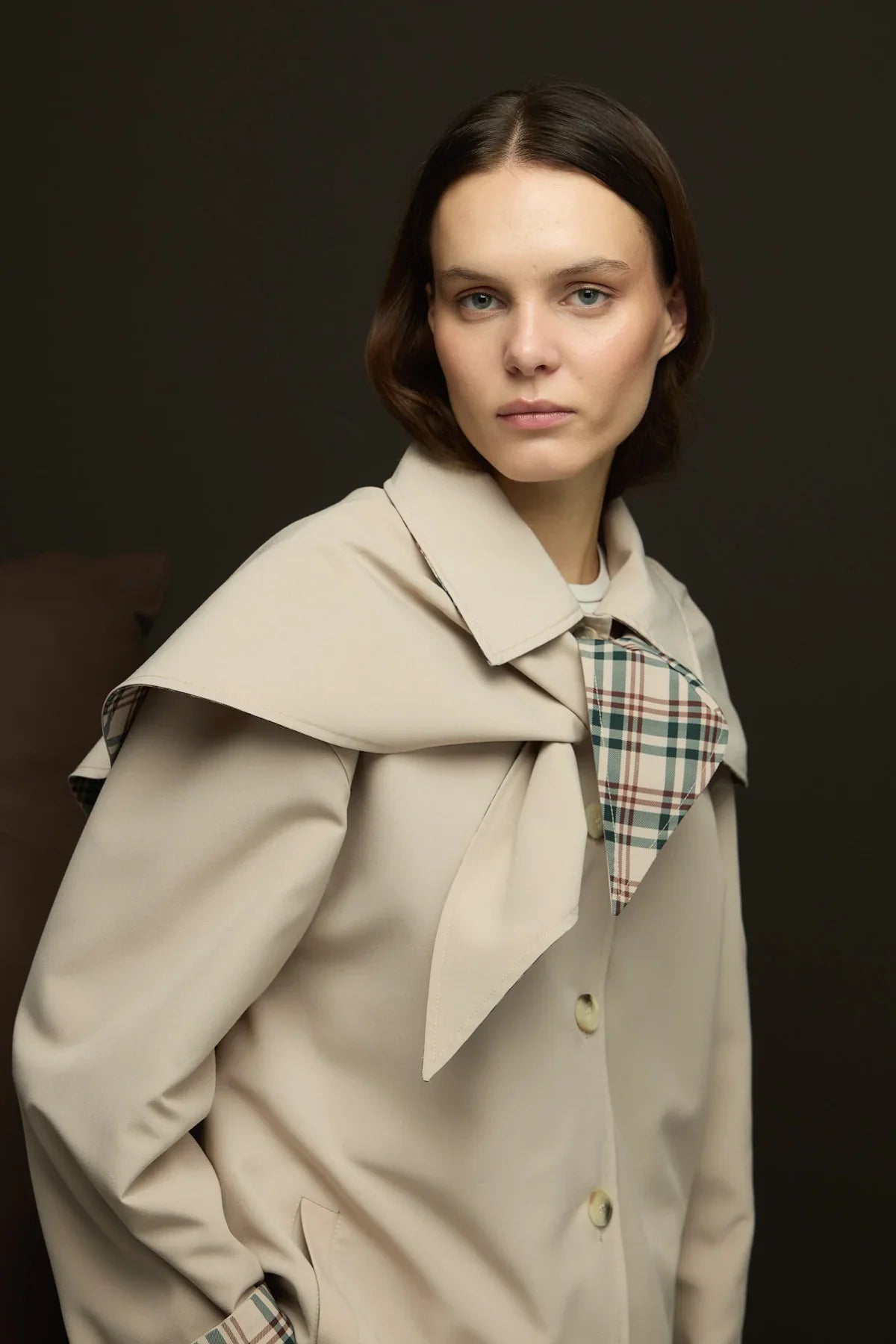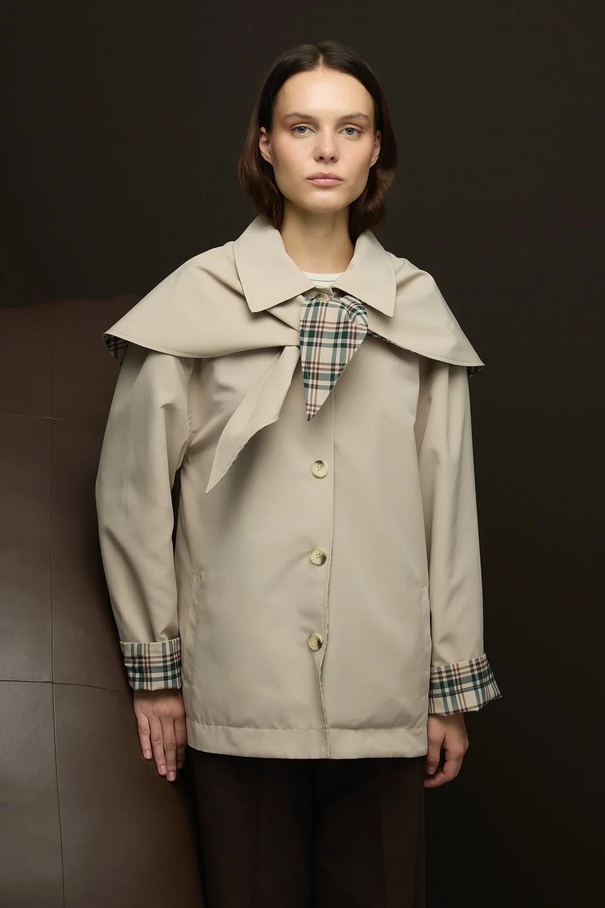 Su itici özellikli  kumaşa ship,punto dikişli,uzun kollu katlı yakalı, seyyar fular detaylı ve önü düğmeli trençkot.