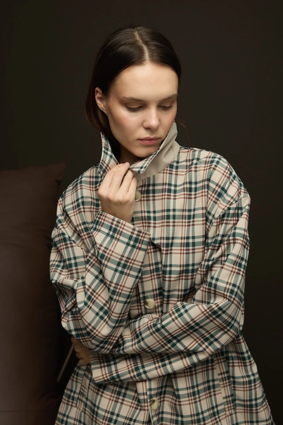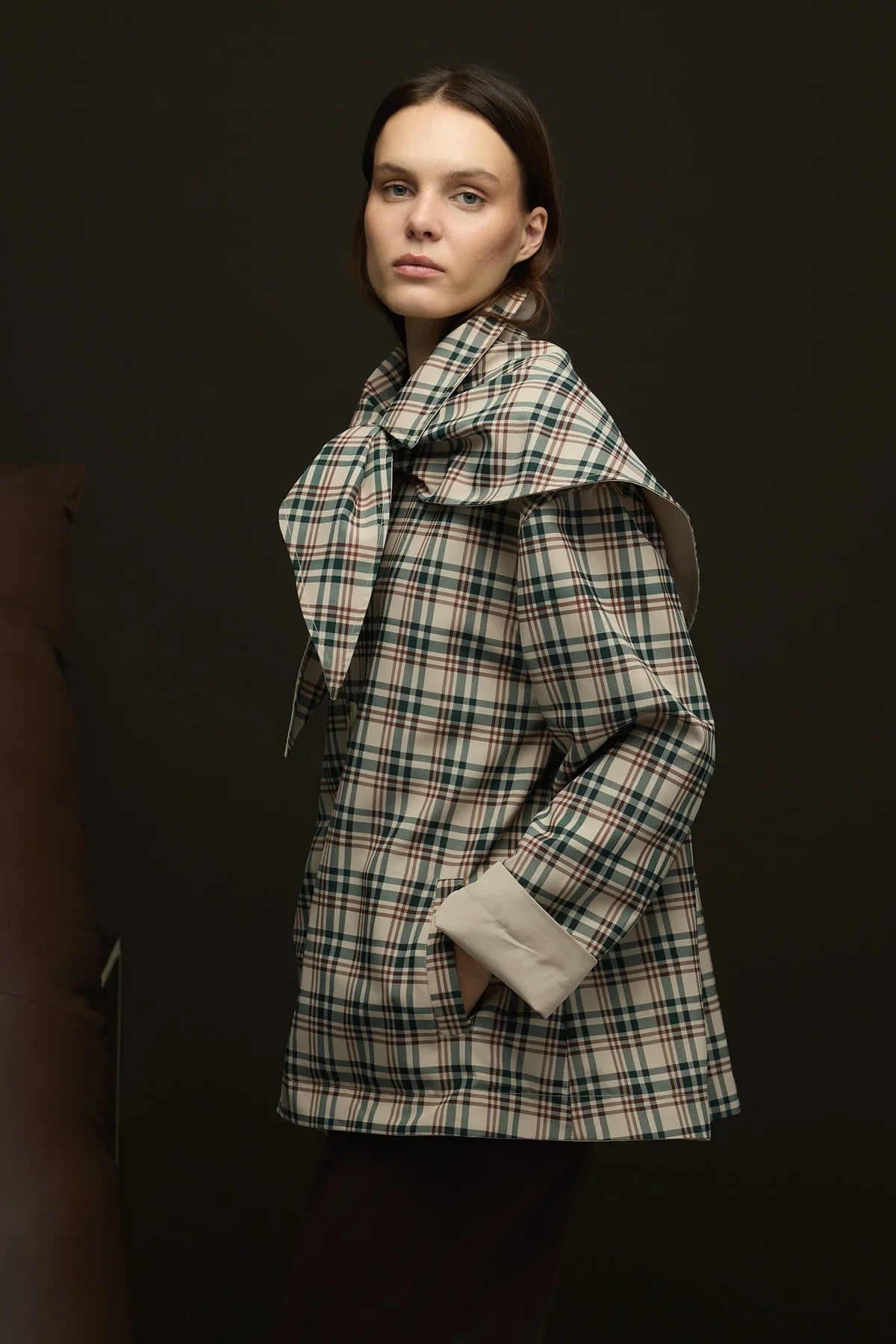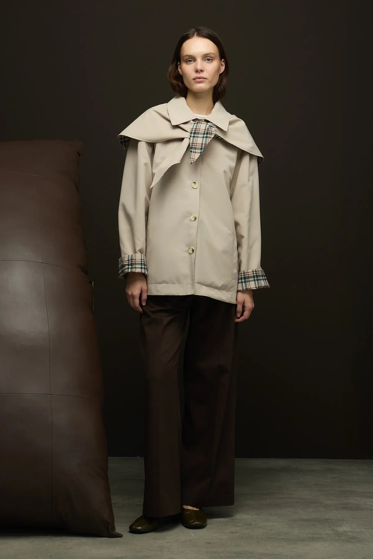 Su itici özellikli  kumaşa ship,punto dikişli,uzun kollu katlı yakalı, seyyar fular detaylı ve önü düğmeli trençkot.