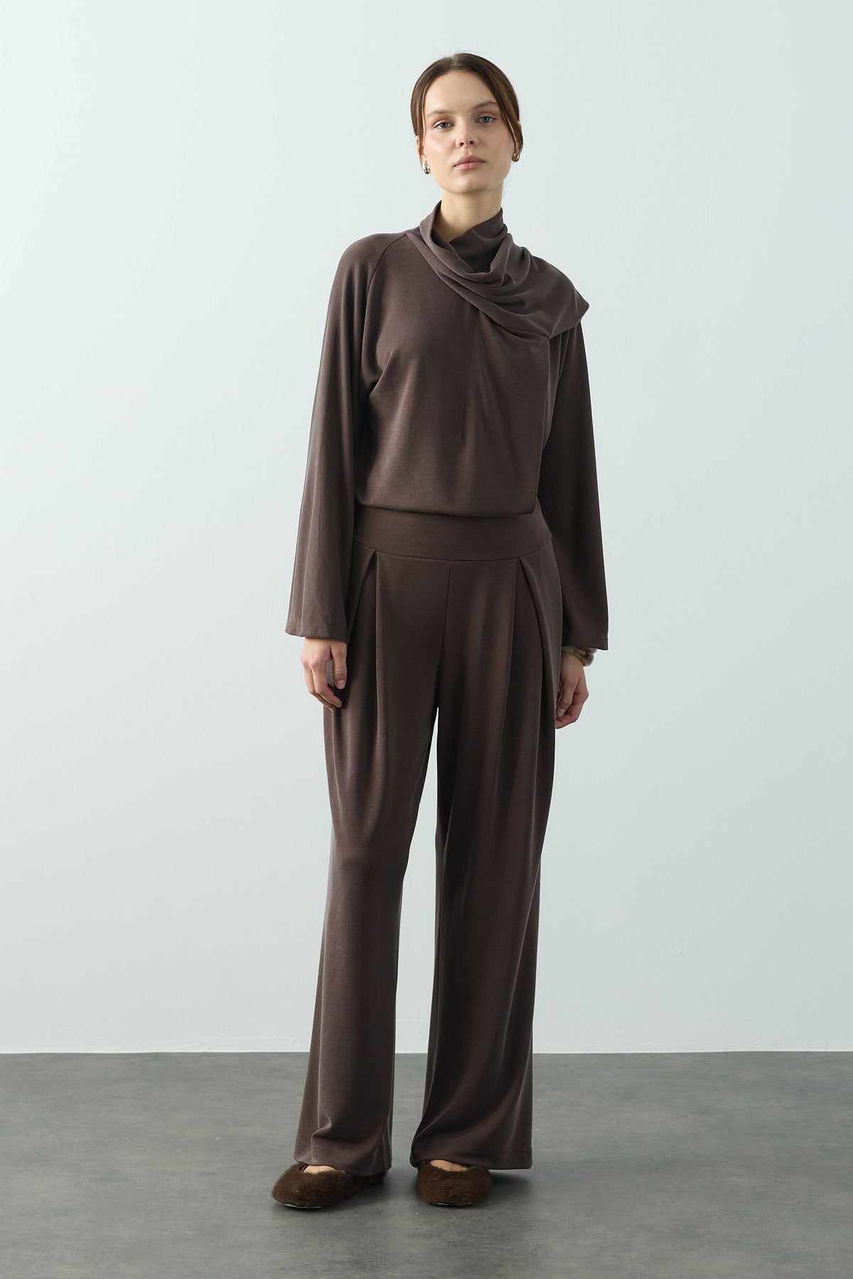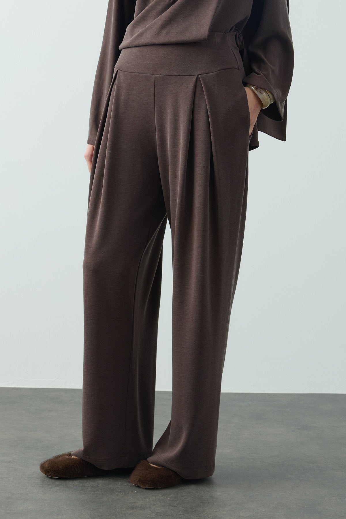 Yumuşak dokusu ve zarif duruşuyla öne çıkan bu pantolon,modal kumaşı sayesinde nefes alabilirlik ve gün boyu konfor sunar. Önden pili detayları rahatlık katarken,bel kemeri vücuda oturması korse görünümü verir.