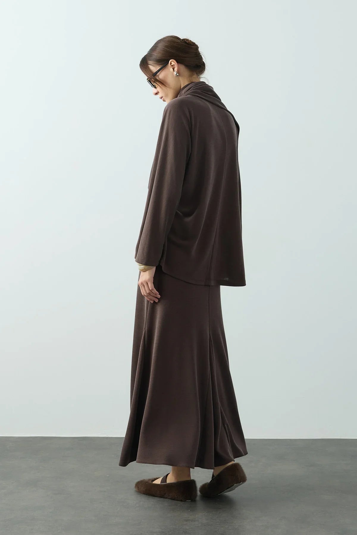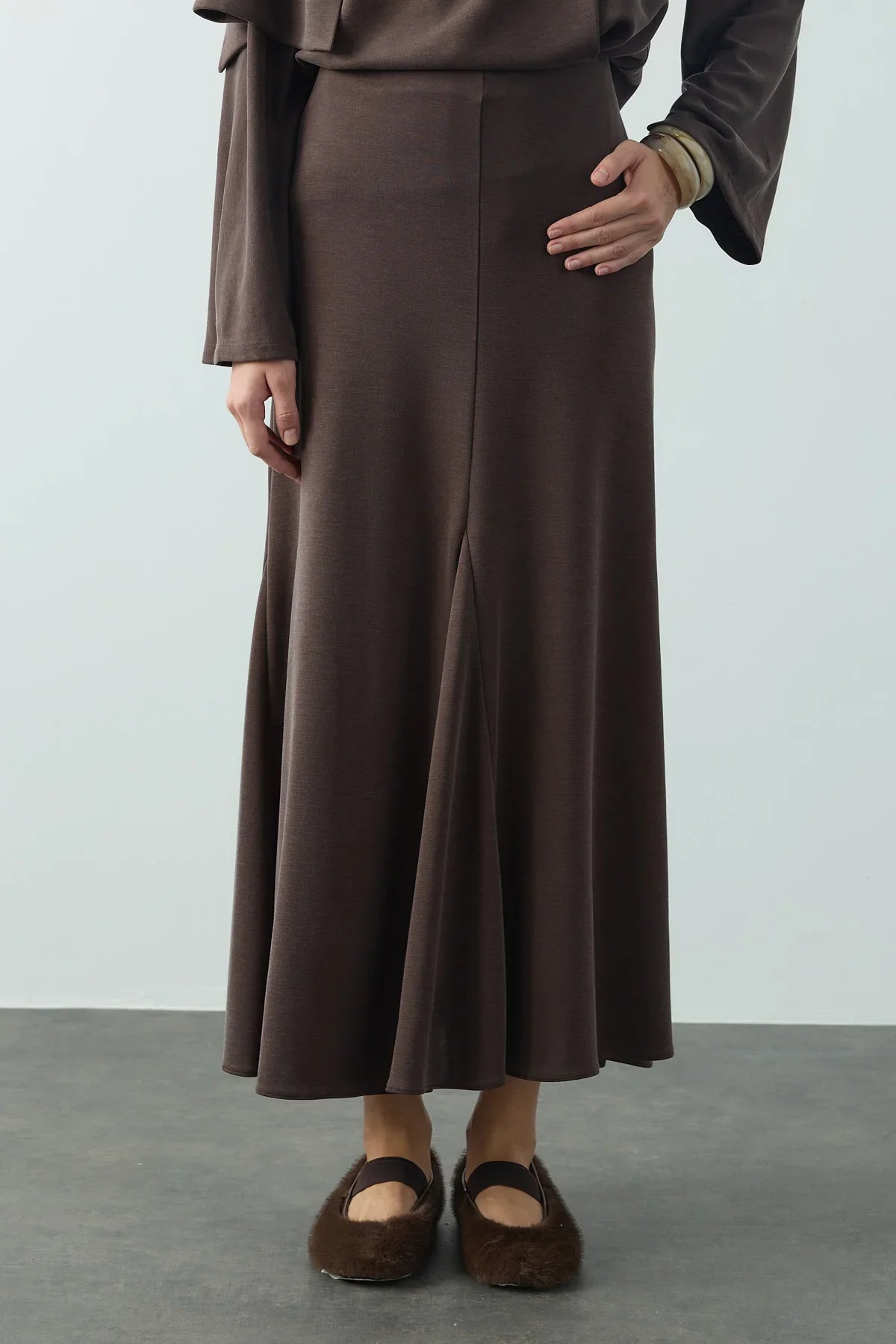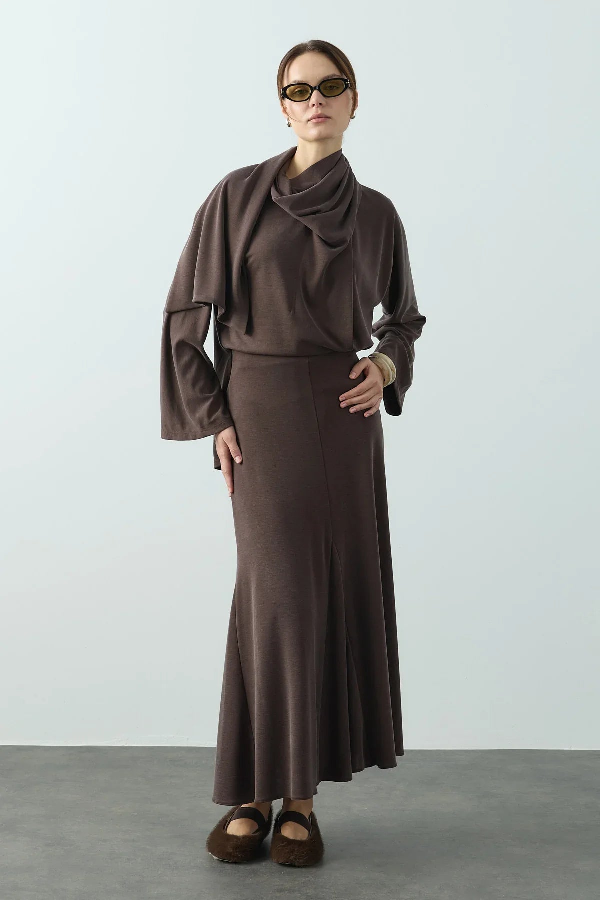 Zarif ve şık tasarımıyla öne çıkan bu etek, beli kemerli tasarımıyla vücuda mükemmel uyum sağlar. Kloş gode kesimi, etekle zarif bir hareket sağlar ve tam boy uzunluğu, şıklığı ve rahatlığı bir arada sunar. Kendinden godeli görünümü eteğe hacim katarken aynı zamanda rahat bir kullanım sunar. Modal kumaşı ise hem yumuşak hem de nefes alabilir, günlük kullanımda veya özel günlerde rahatlıkla tercih edilebilir.