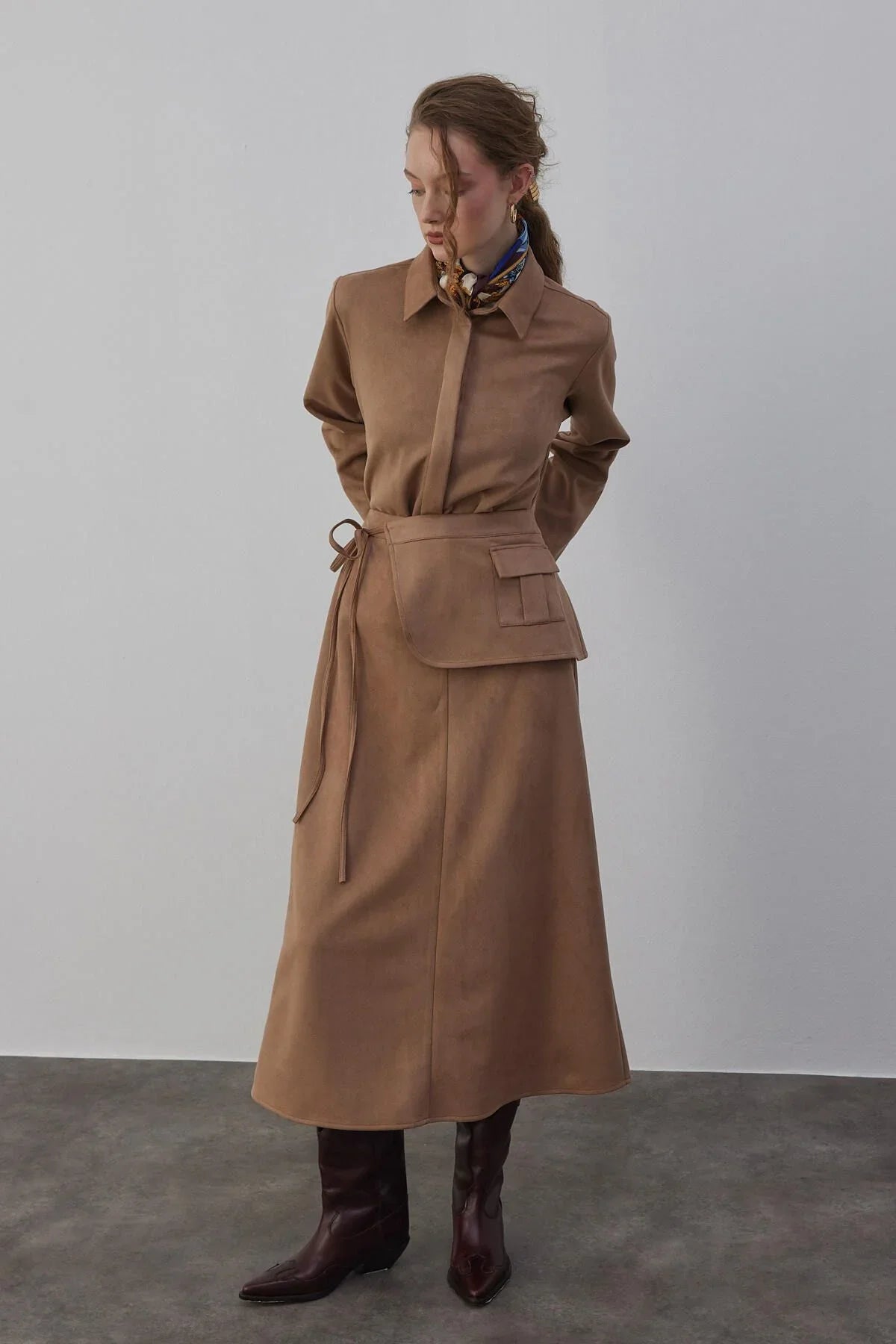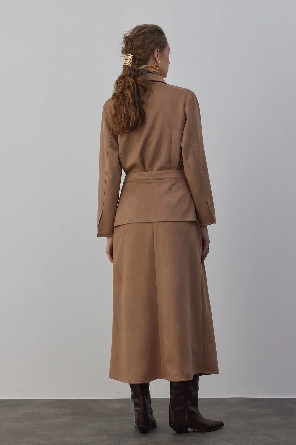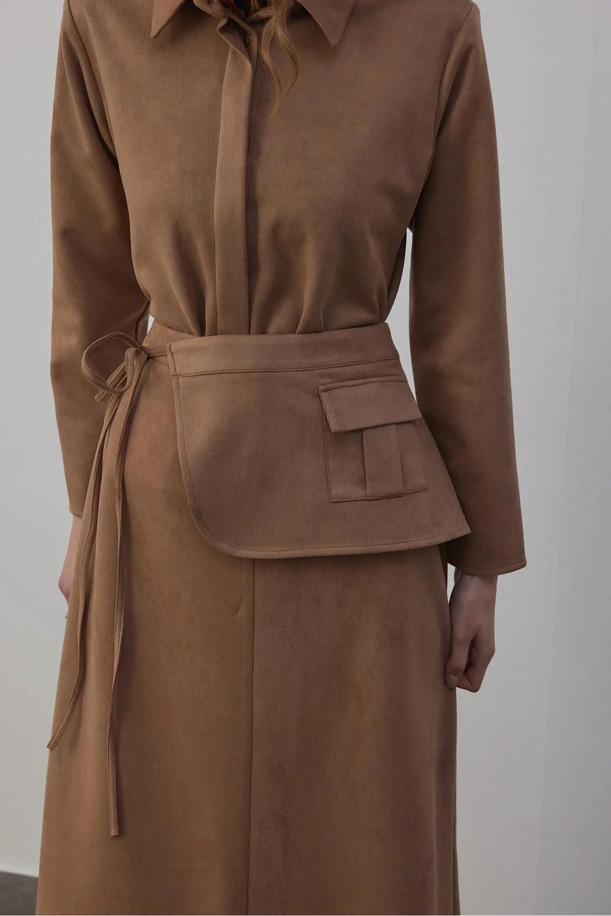 Kamisa Süet Gömlek ve Etek Takım Vizon