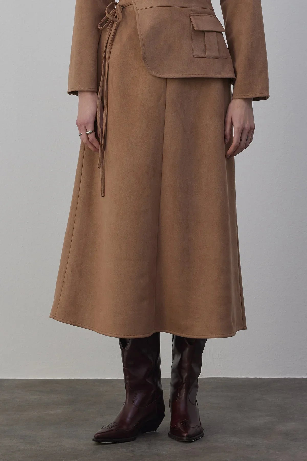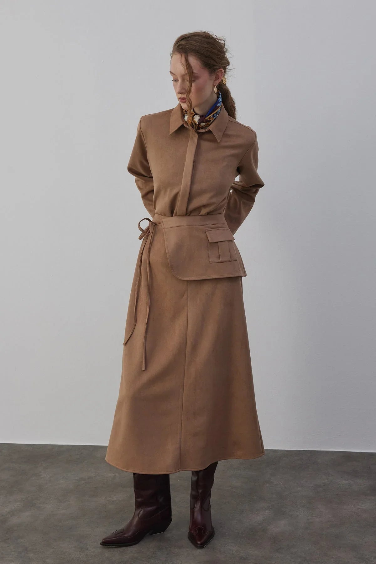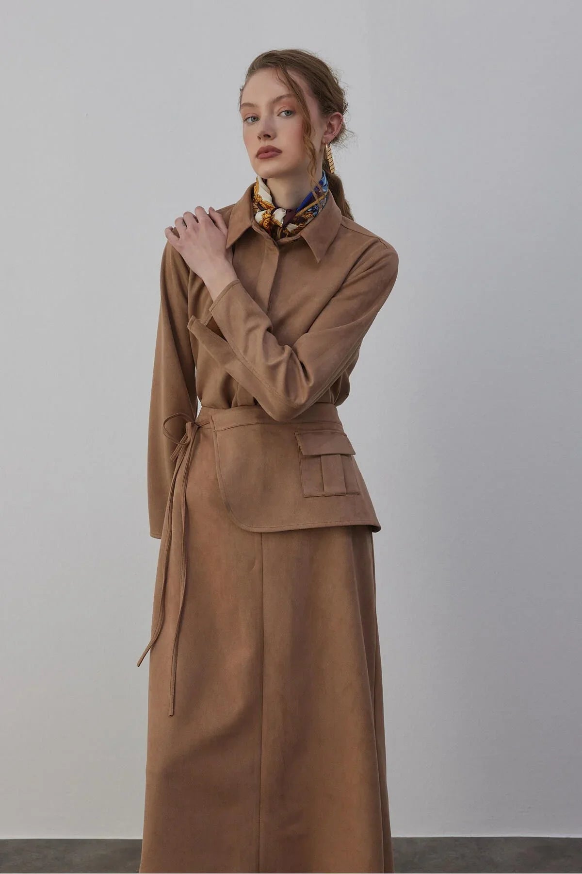 Kamisa Süet Gömlek ve Etek Takım Vizon