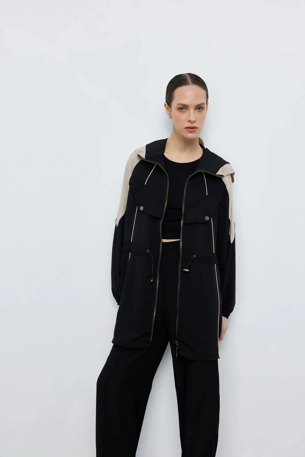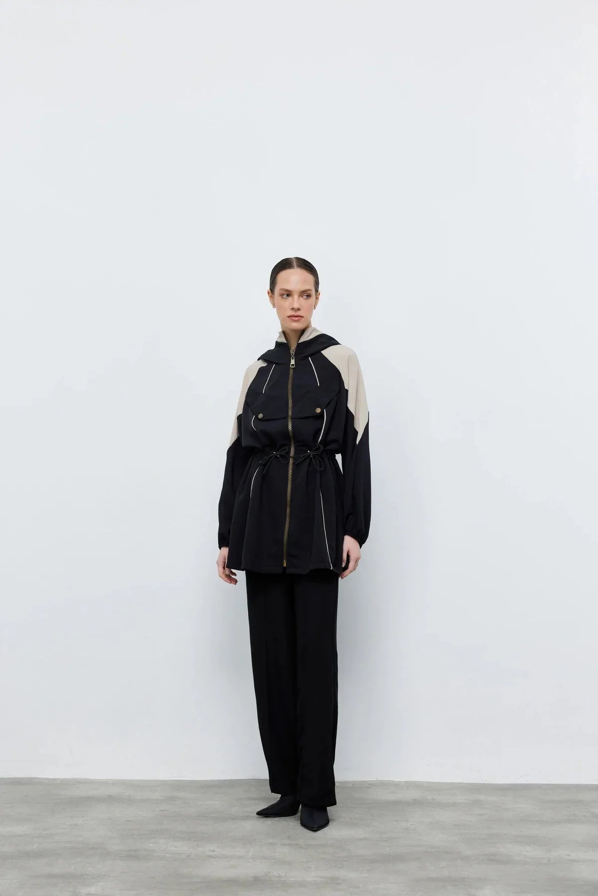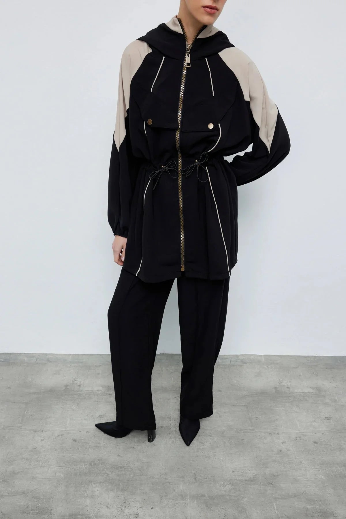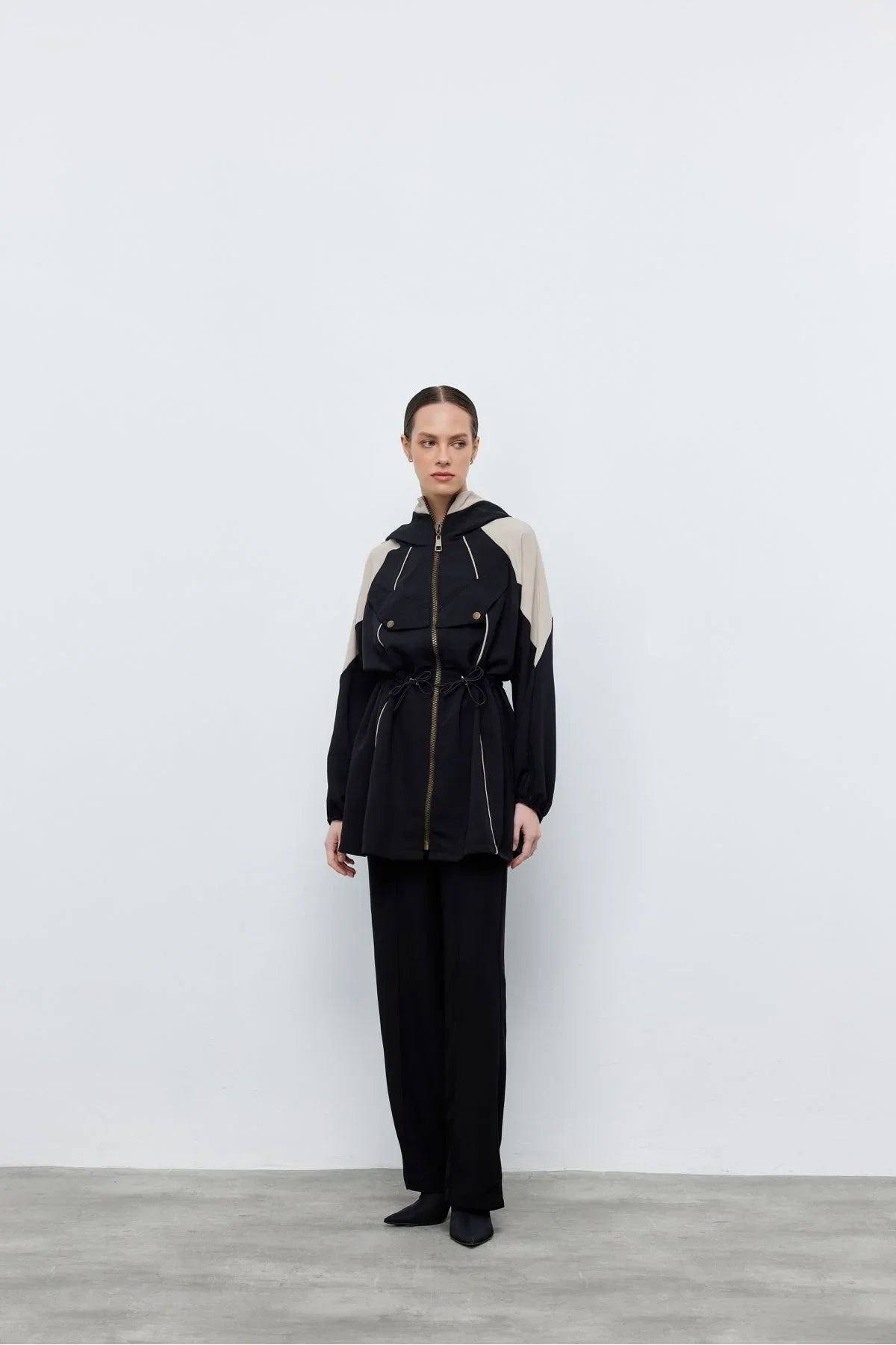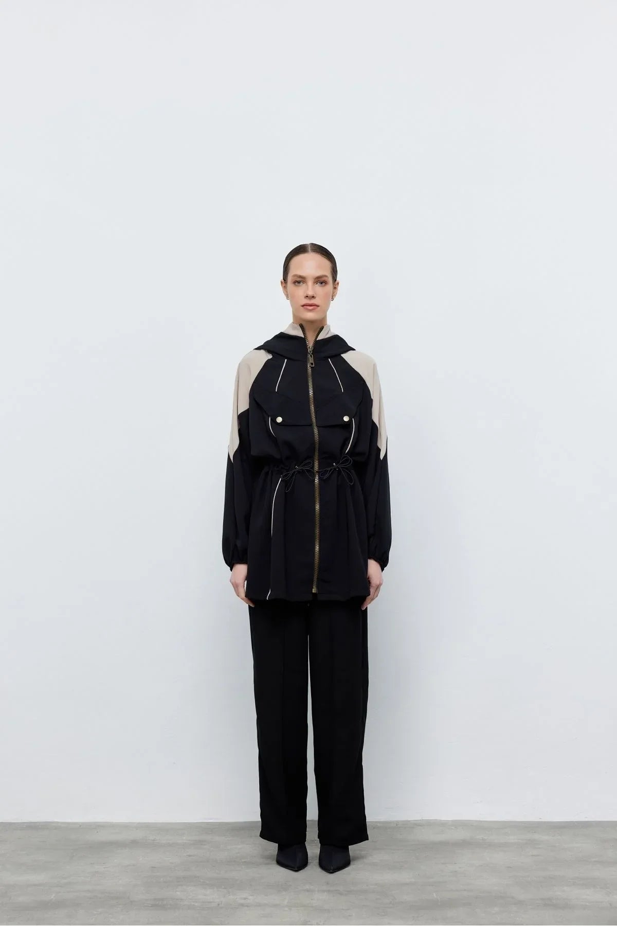 Kontrast Bel Büzgülü Ceket Pantolon Siyah
