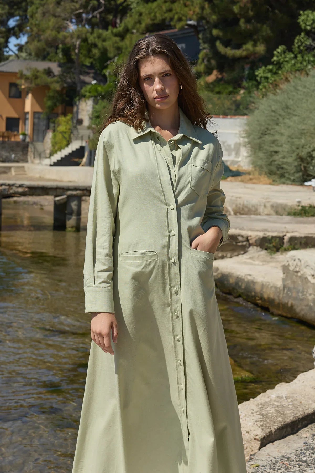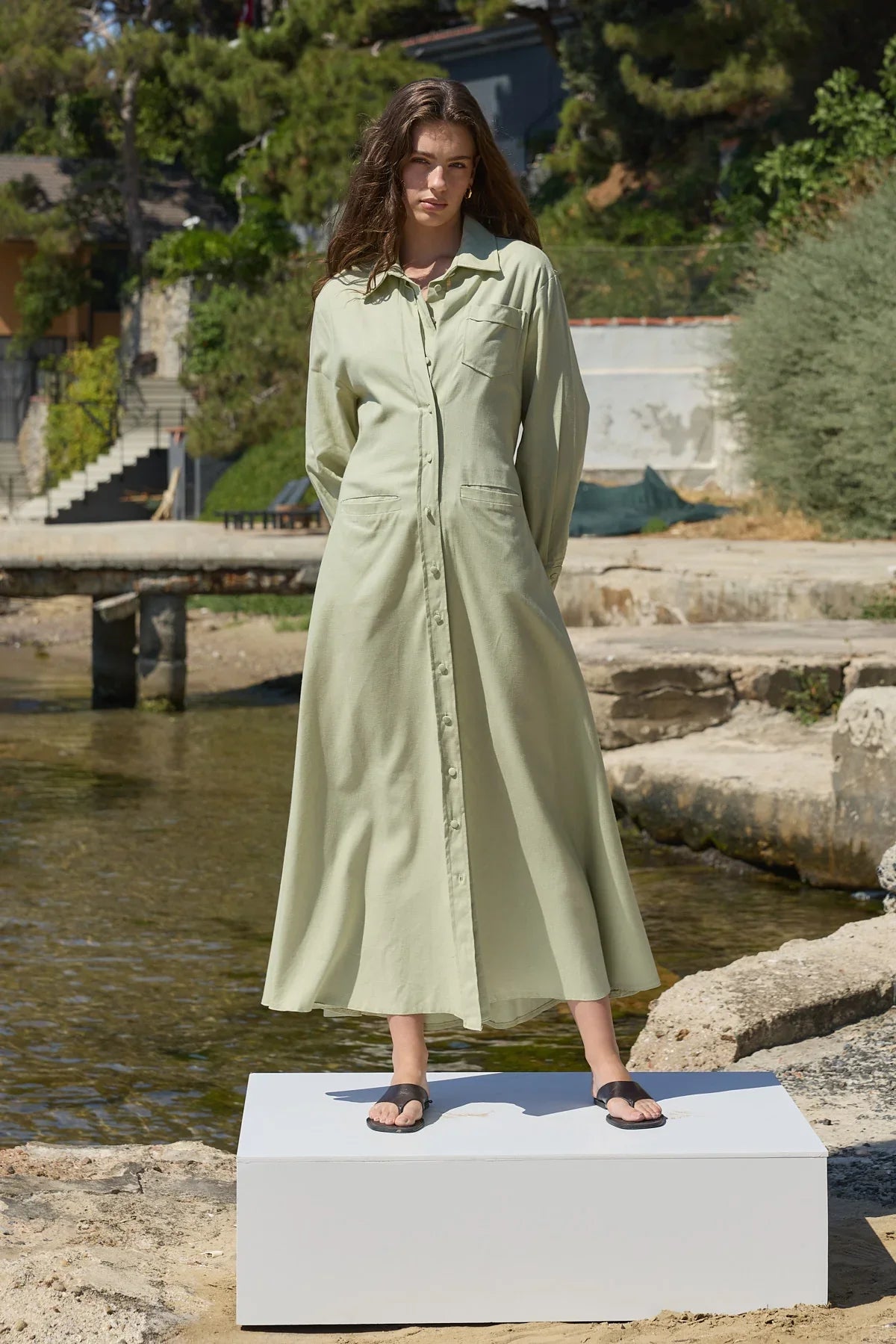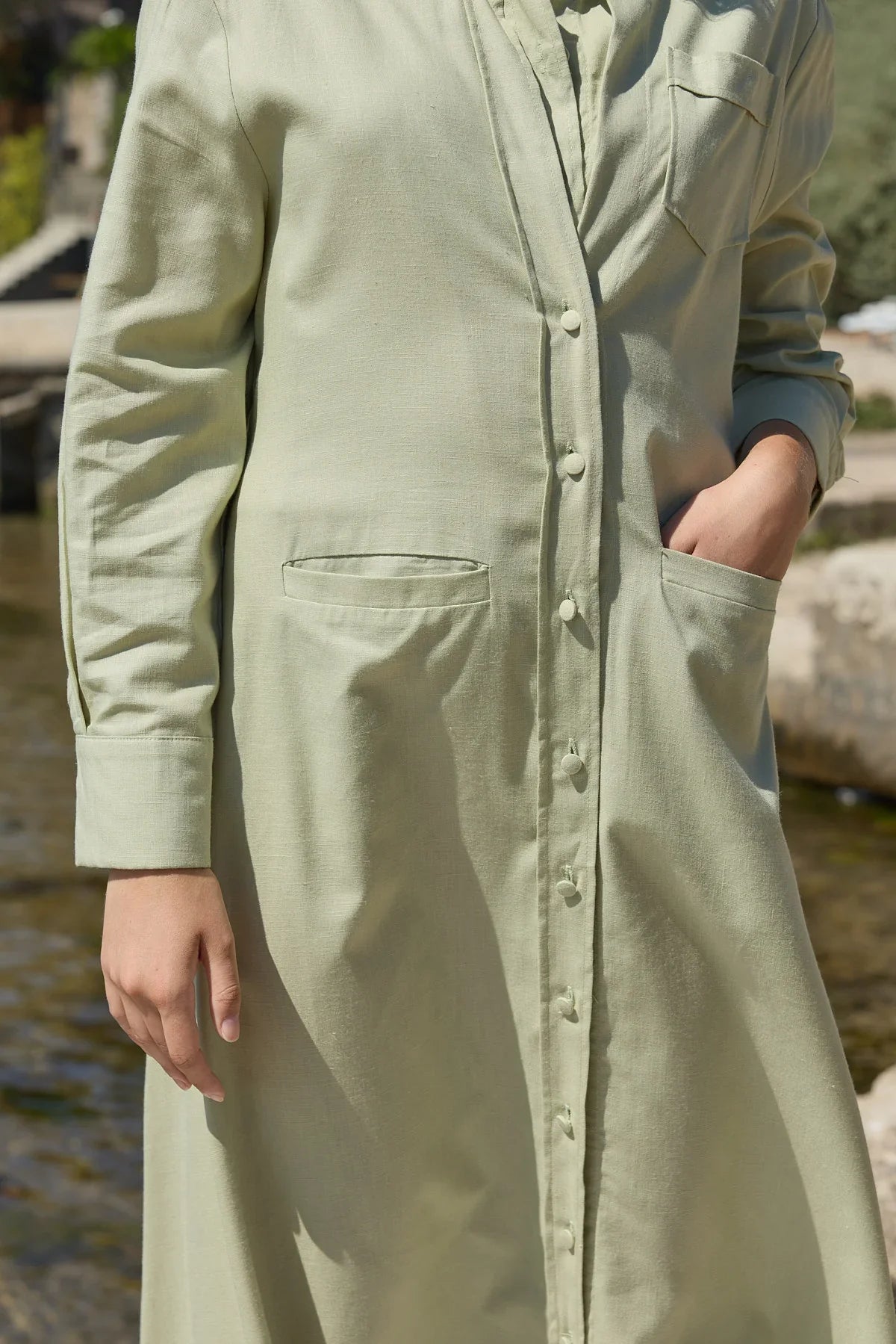 Mist Keten Düğmeli Elbise Açık Yeşil
