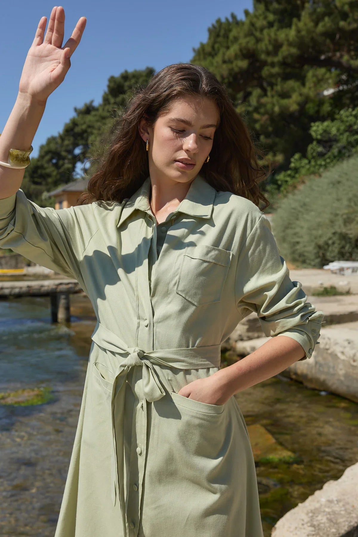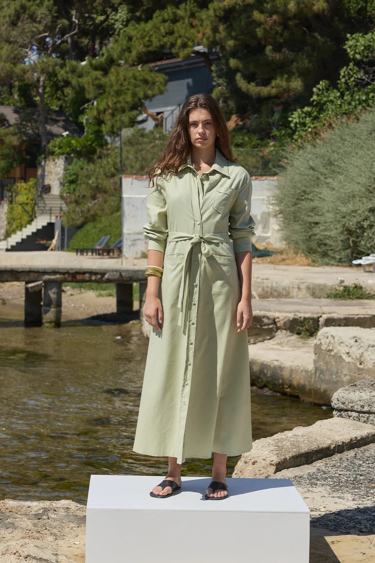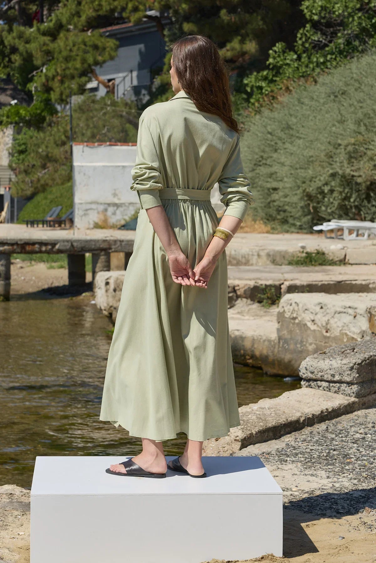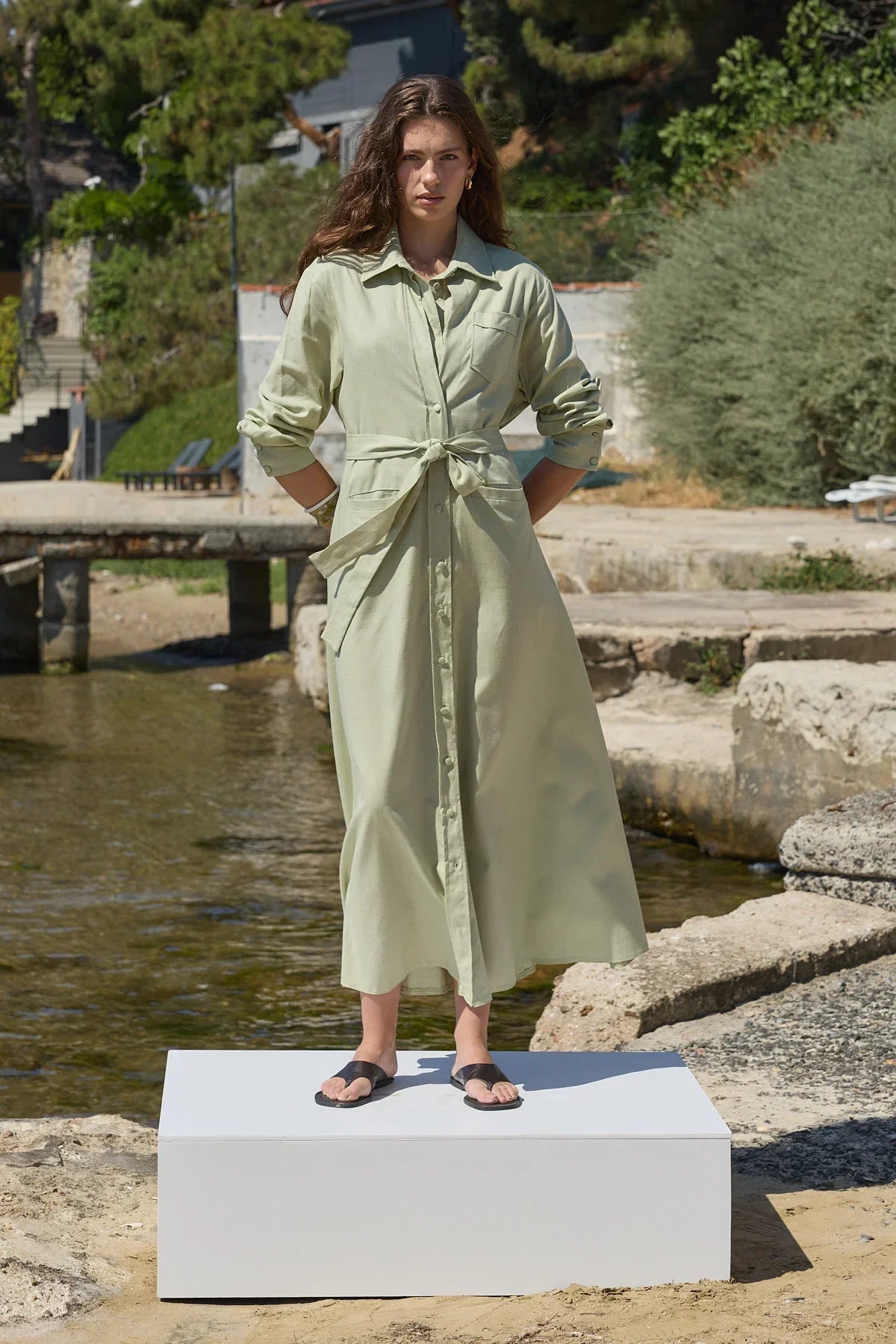 Mist Keten Düğmeli Elbise Açık Yeşil