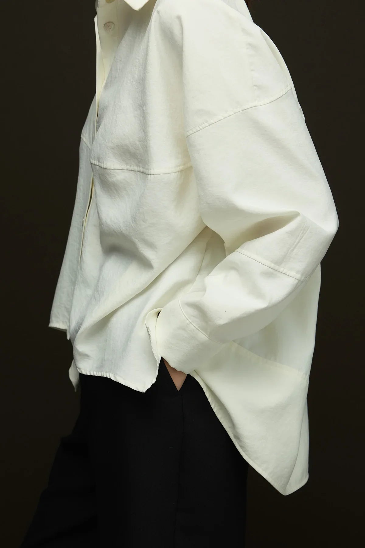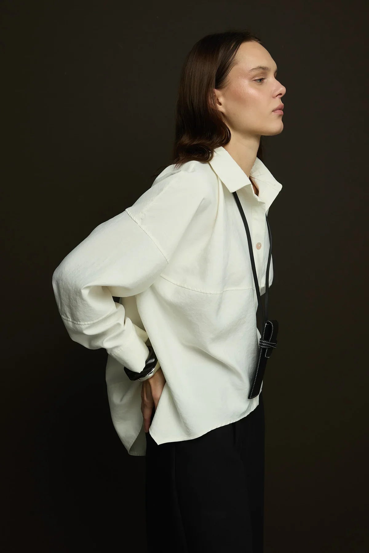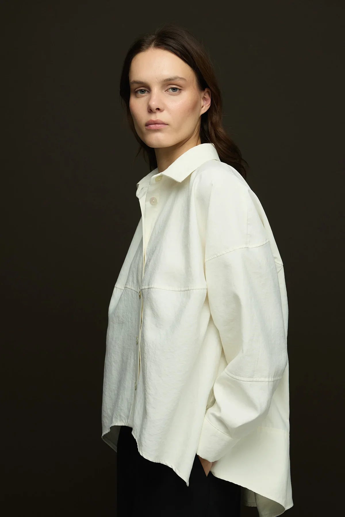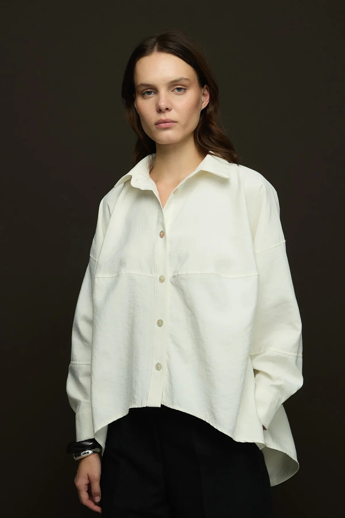Geniş yaka,yandan yırtmaçlı geniş kesim gömlek.