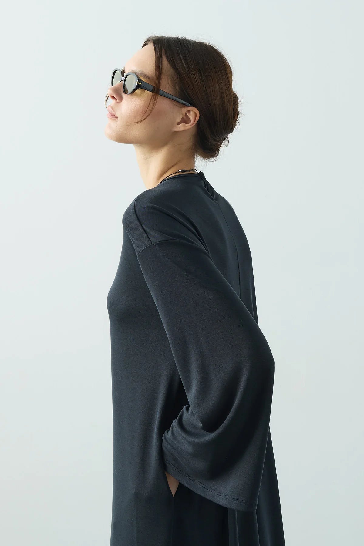 Zarif ve rahat tasarımıyla öne çıkan elbise uzun kesimi, geniş kollarıyla dikkat çekiyor.Modal kumaşı sayesinde hafif, nefes alabilir ve cilt dostu bir yapıya sahiptir.