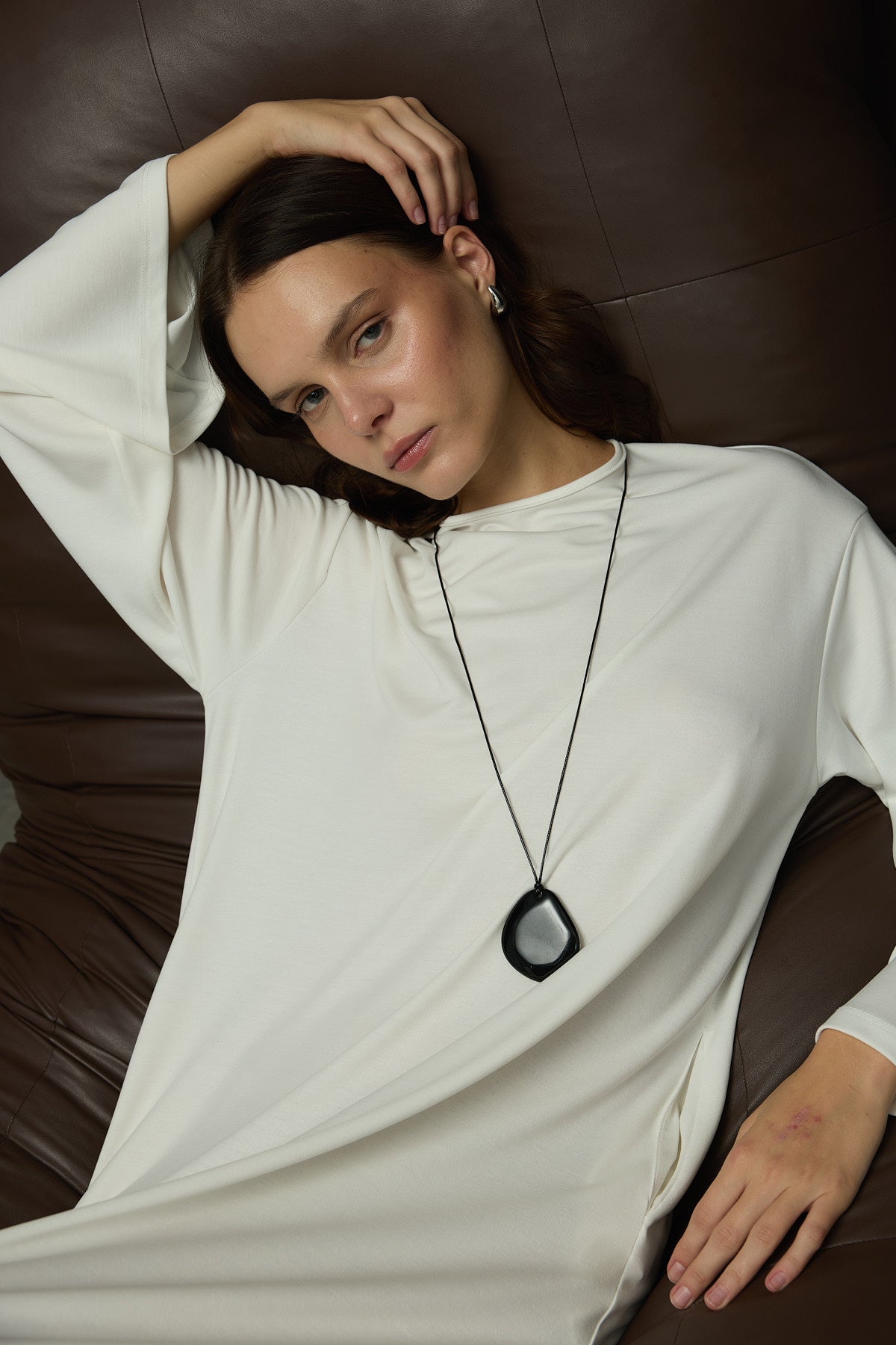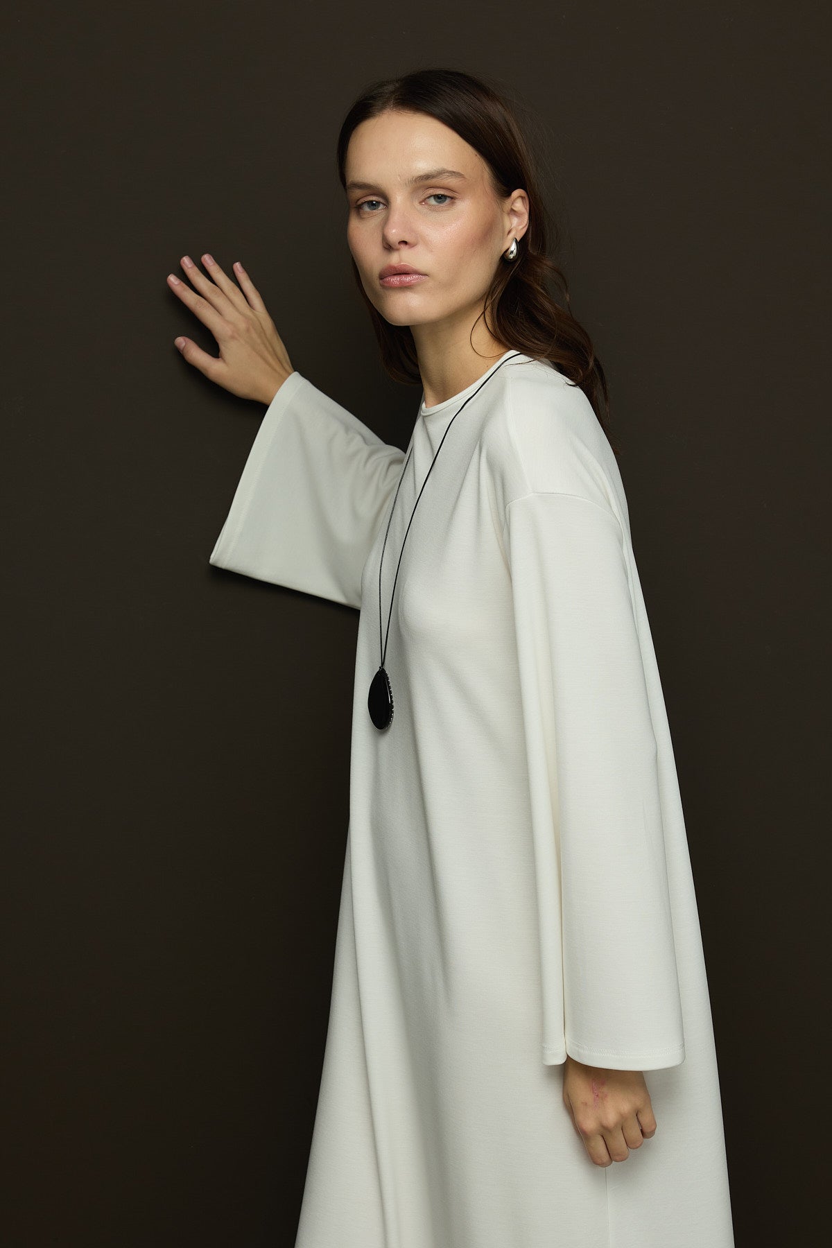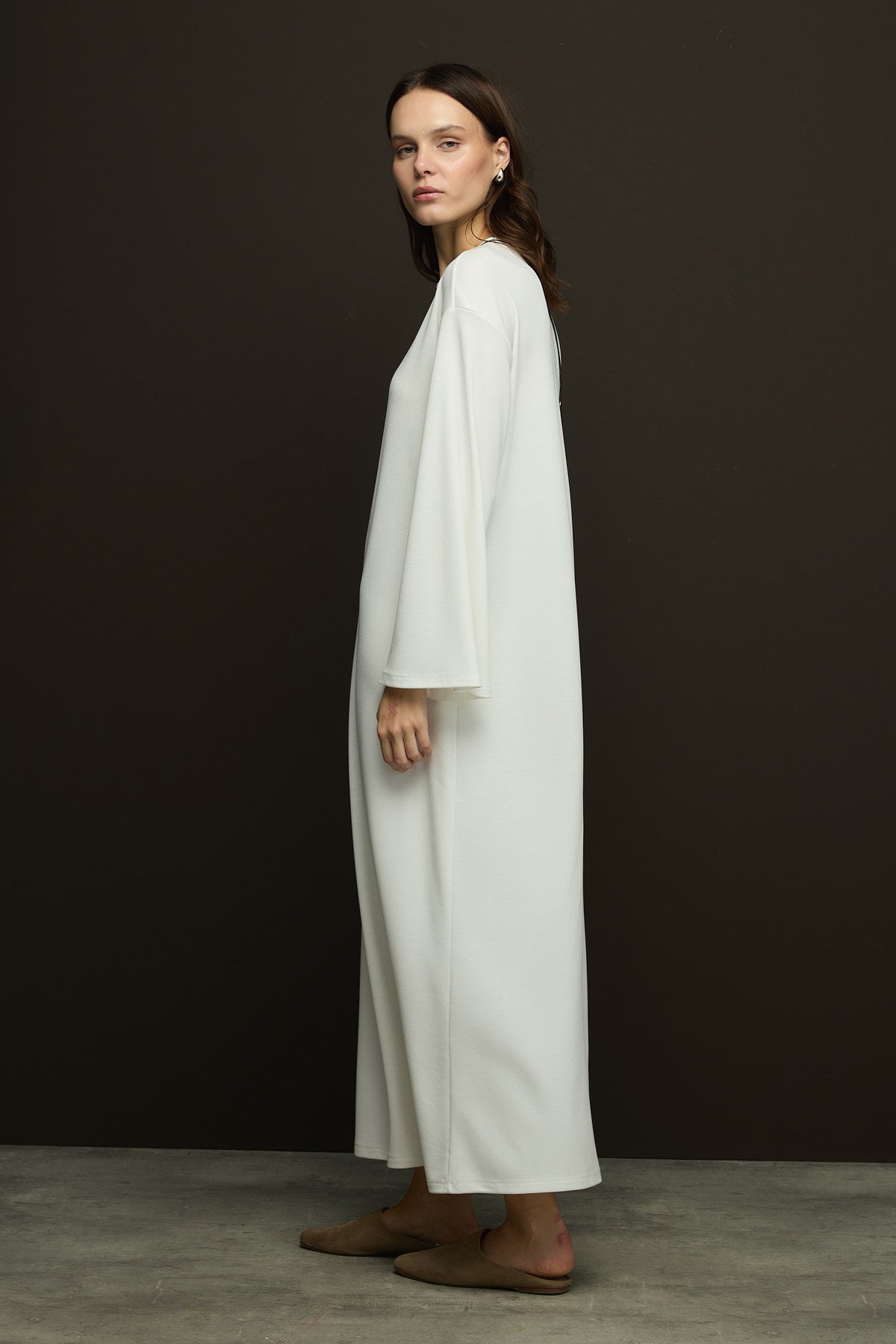 Zarif ve rahat tasarımıyla öne çıkan elbise uzun kesimi, geniş kollarıyla dikkat çekiyor.Modal kumaşı sayesinde hafif, nefes alabilir ve cilt dostu bir yapıya sahiptir.