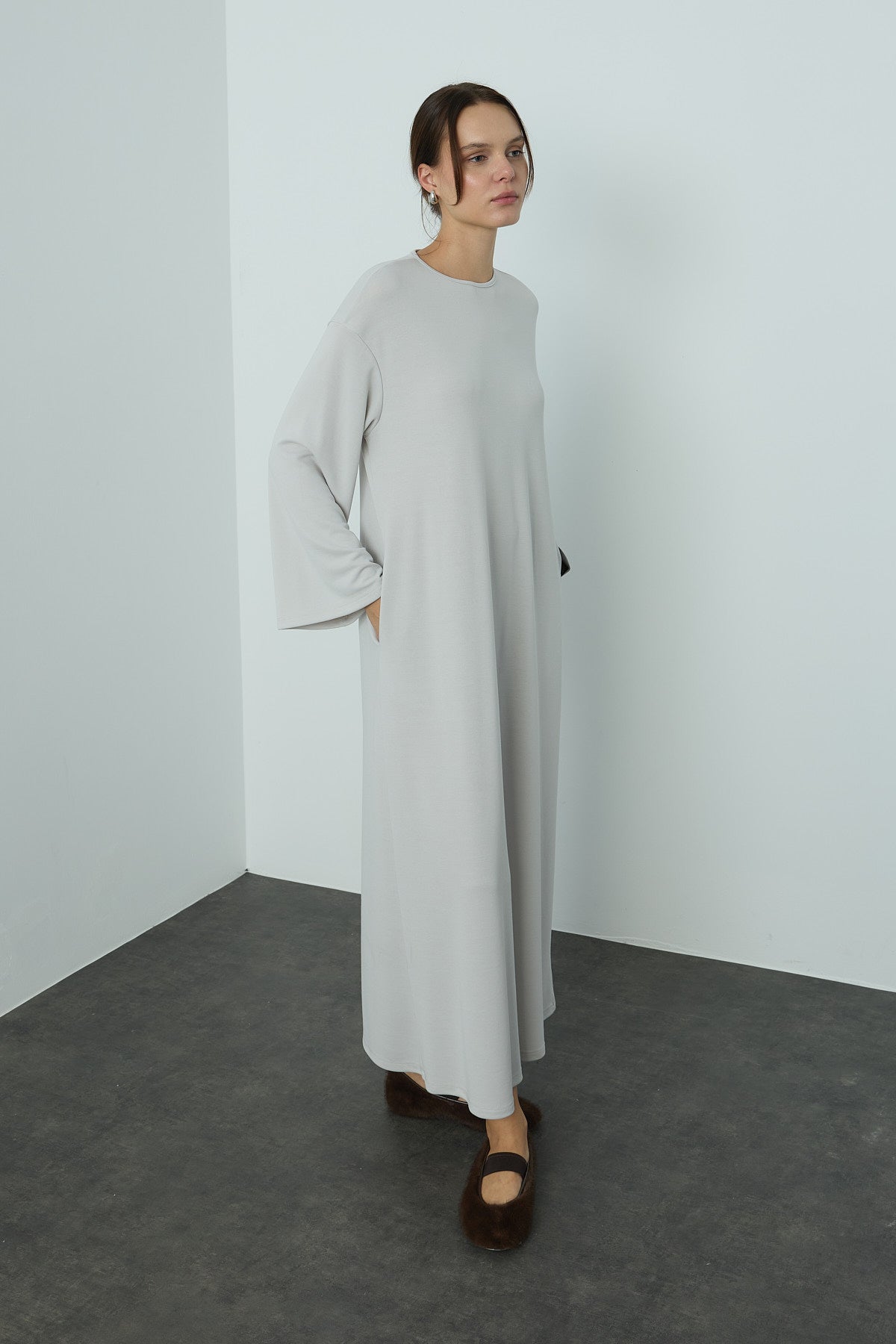Zarif ve rahat tasarımıyla öne çıkan elbise uzun kesimi, geniş kollarıyla dikkat çekiyor.Modal kumaşı sayesinde hafif, nefes alabilir ve cilt dostu bir yapıya sahiptir.