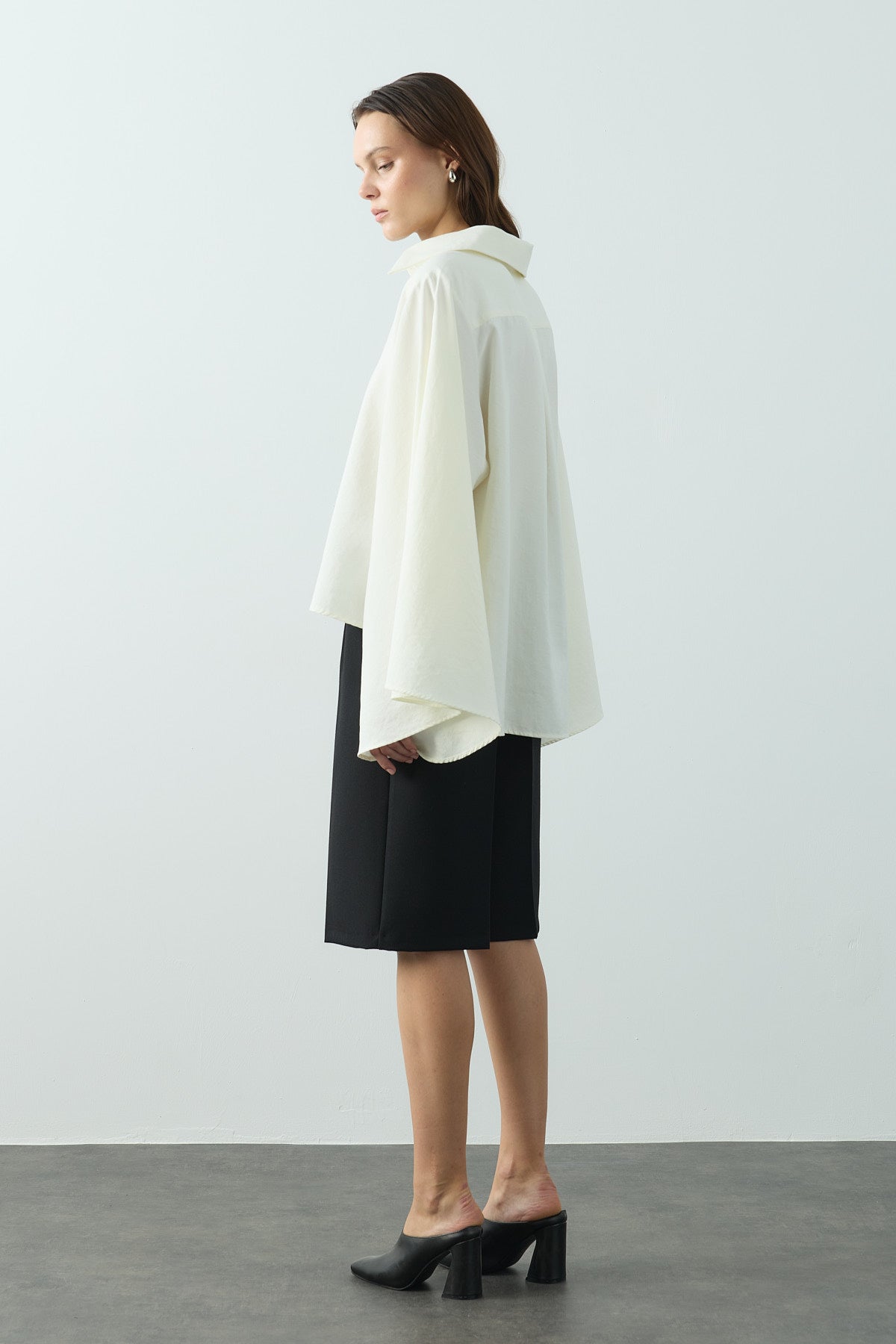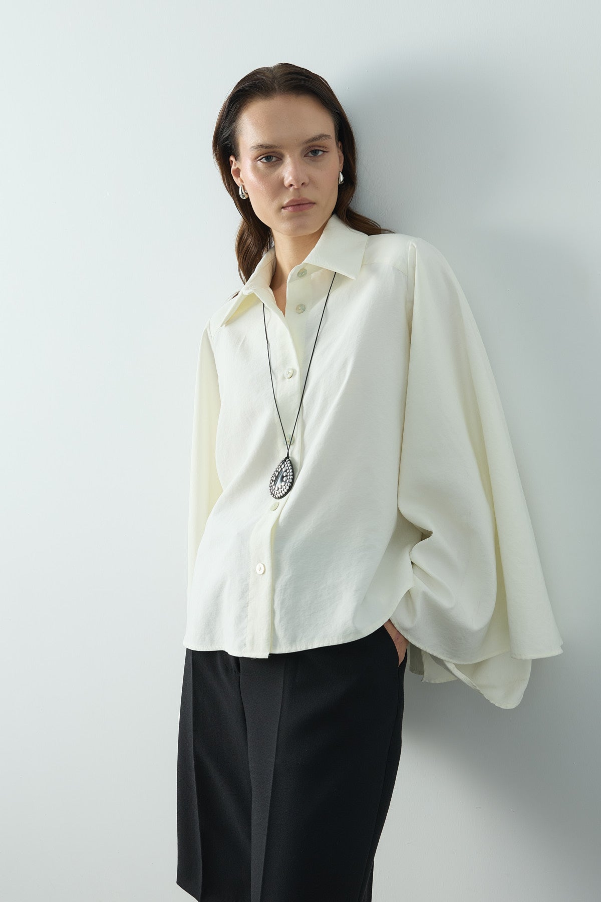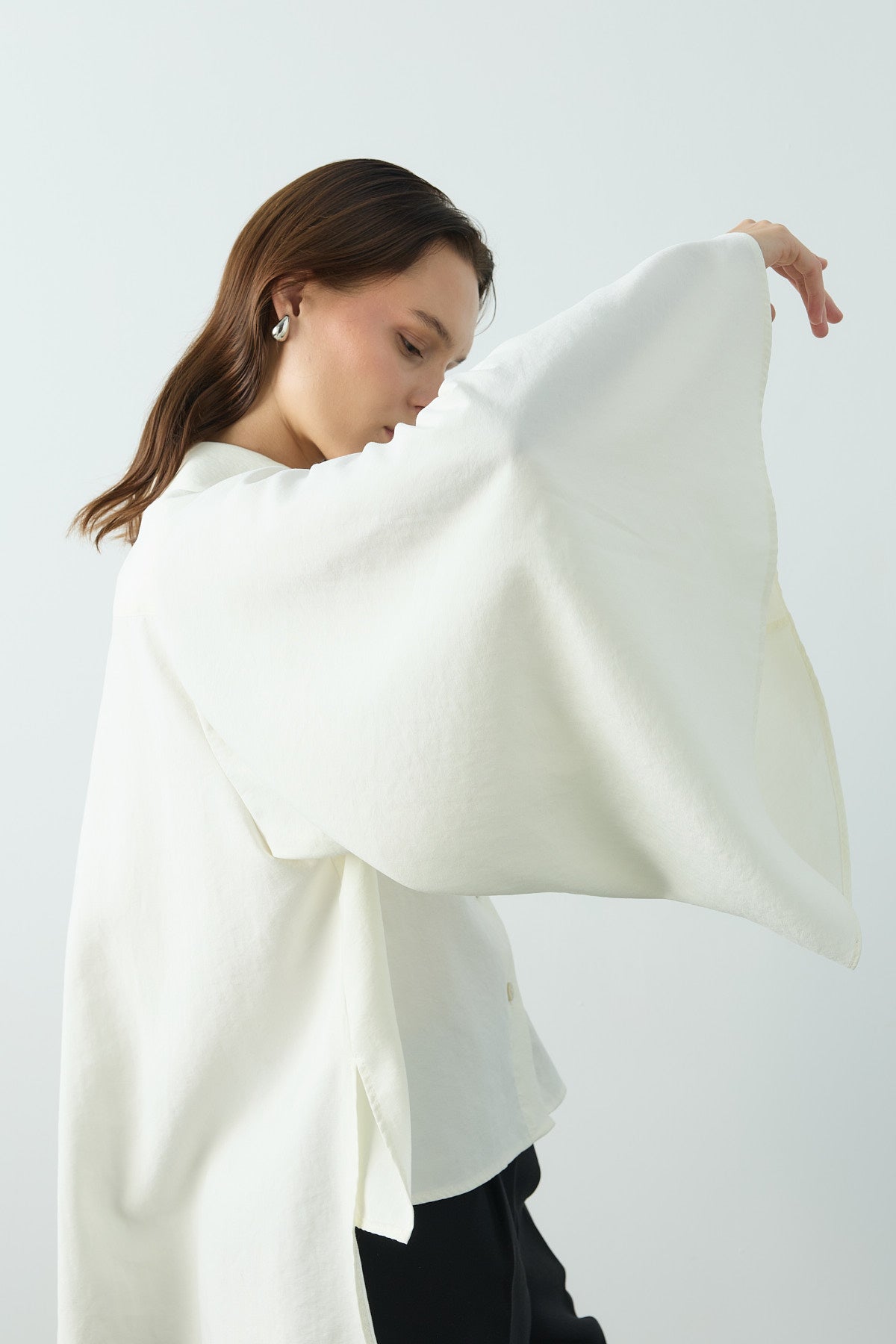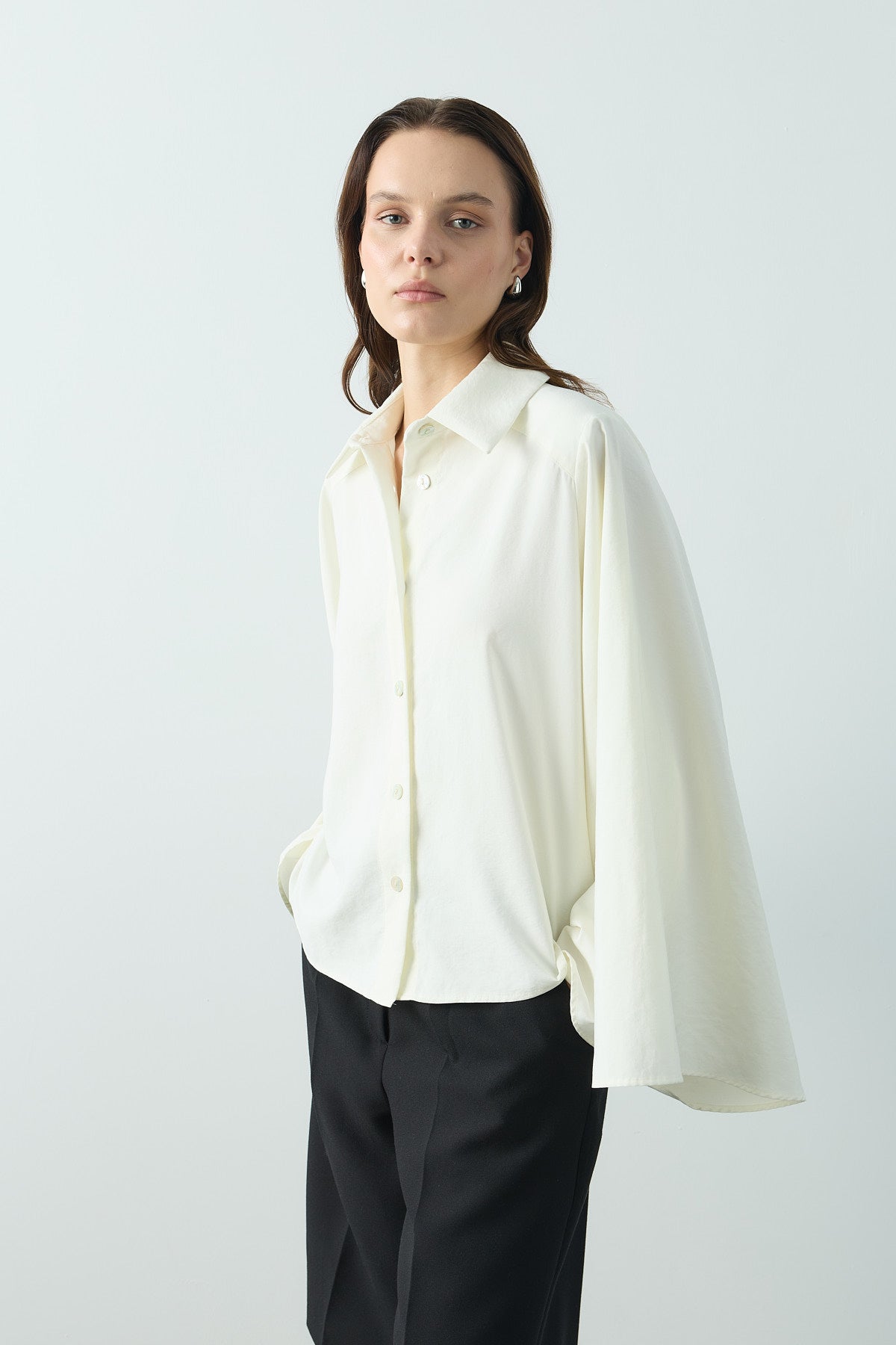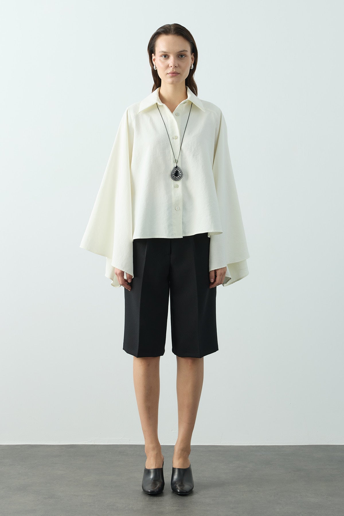 Ürün Açıklama ; Geniş yaka,yandan yırtmaçlı,geniş pelerin kol detaylı gömlek.Ön Boy 65 cm Arka Boy 75 cm