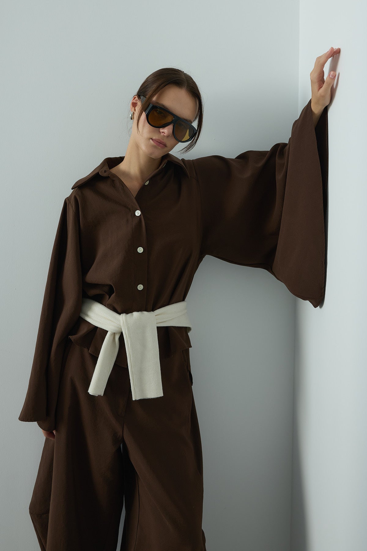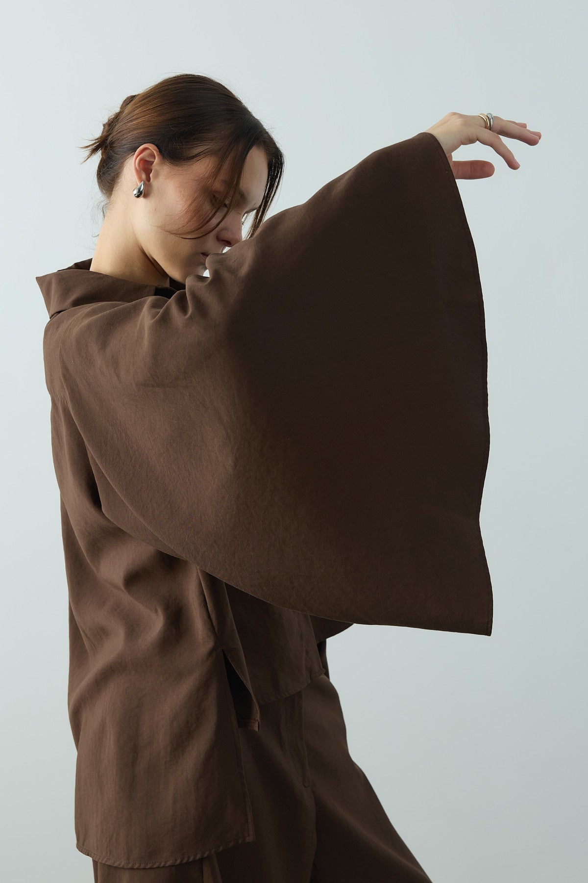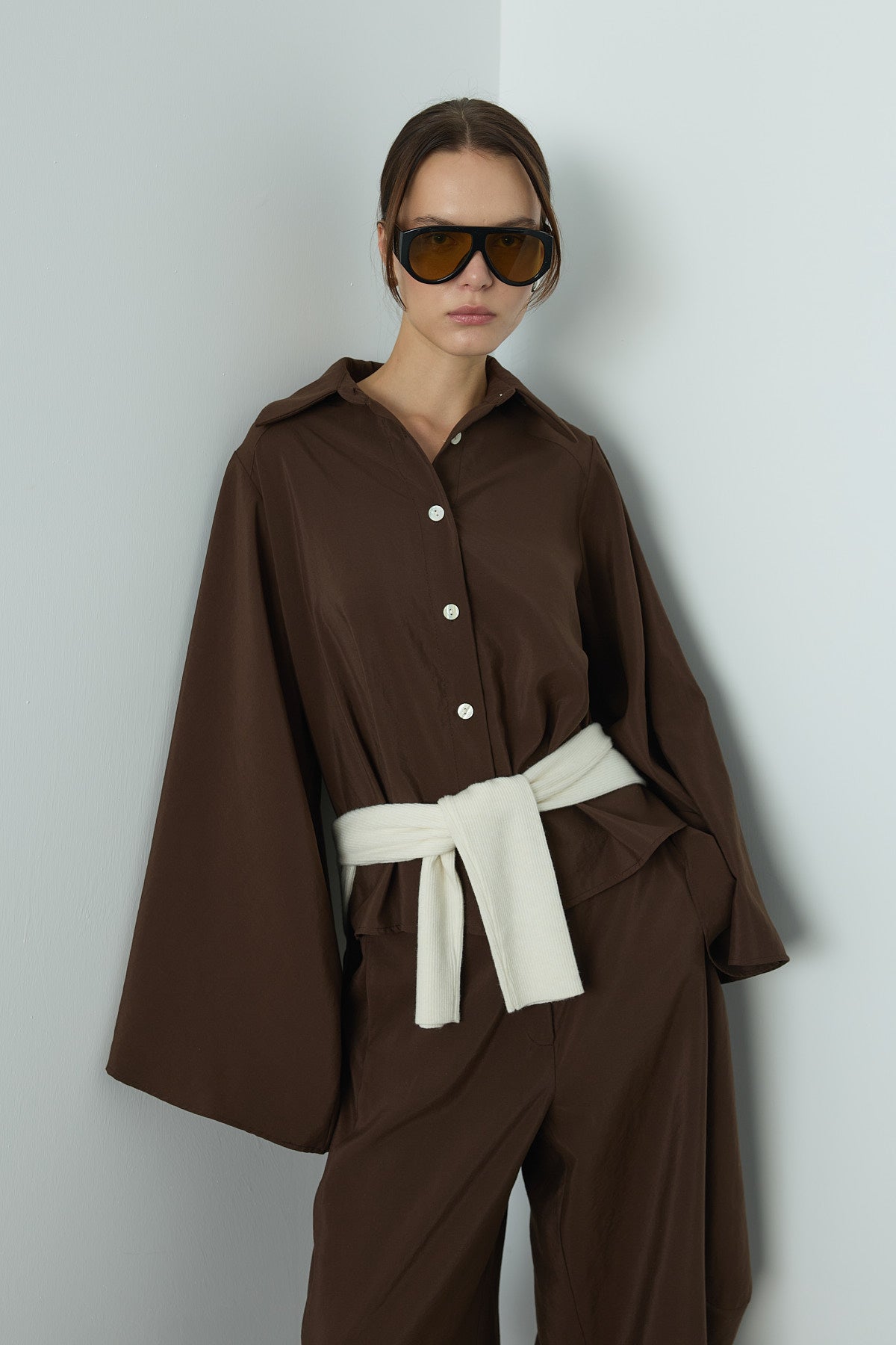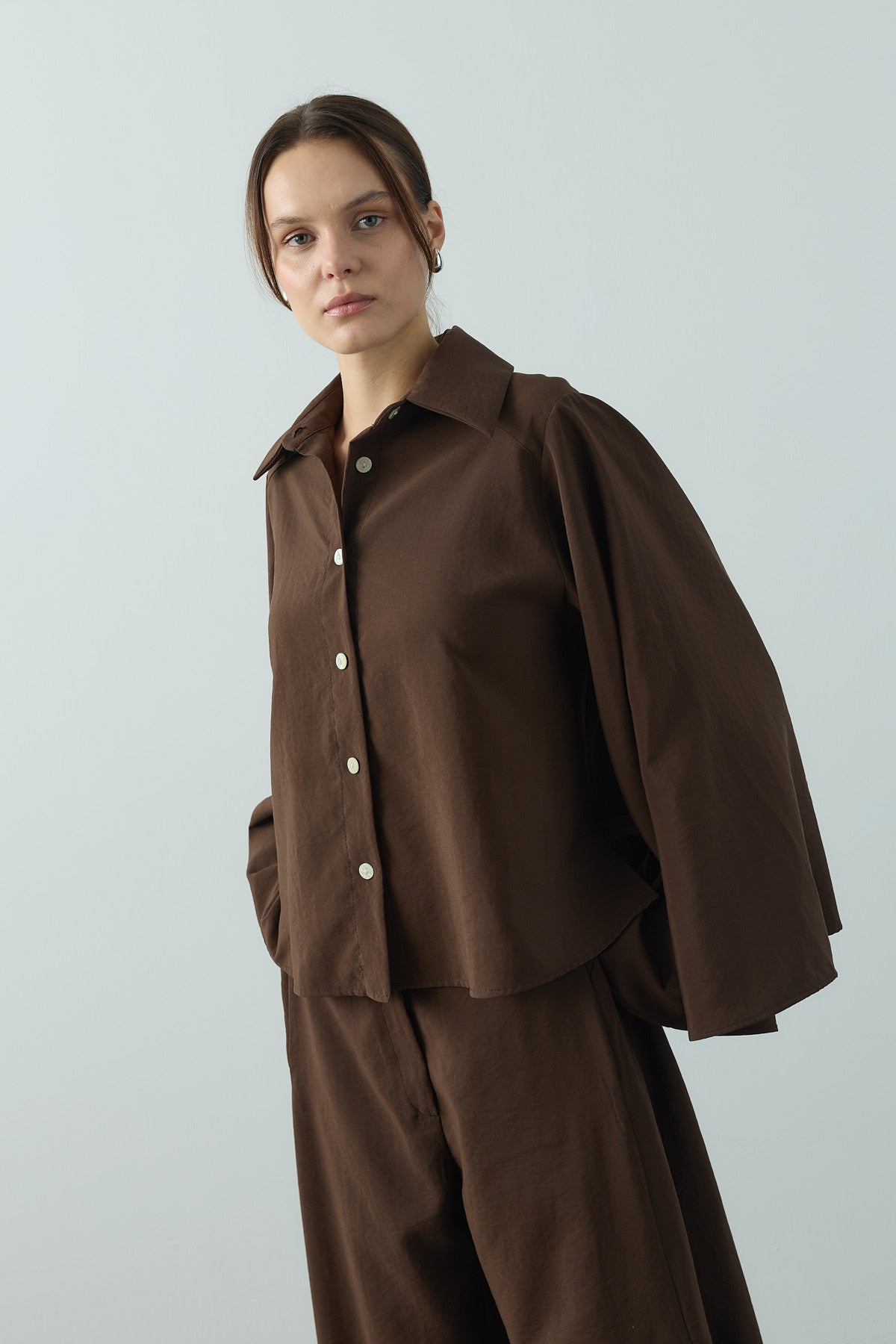 Ürün Açıklama ; Geniş yaka,yandan yırtmaçlı,geniş pelerin kol detaylı gömlek.Ön Boy 65 cm Arka Boy 75 cm