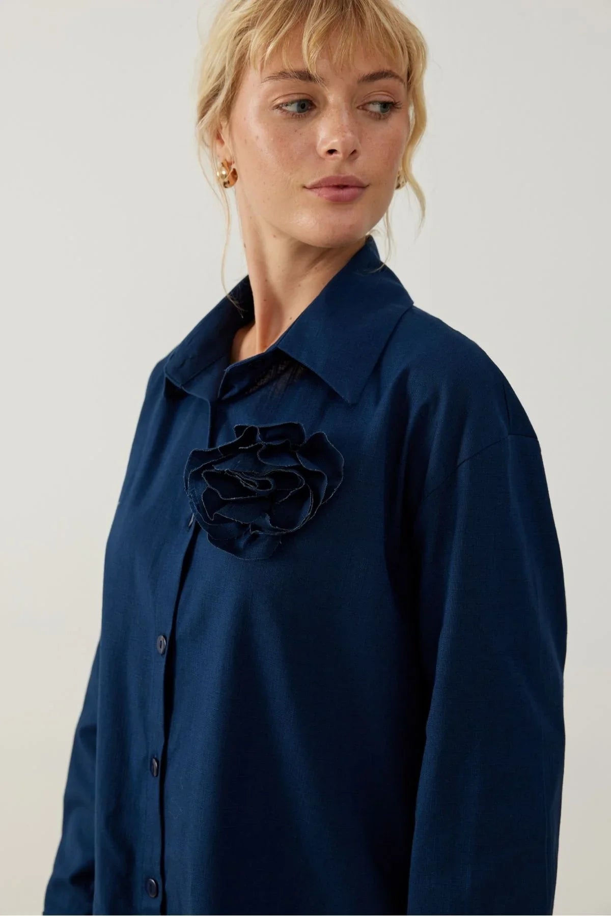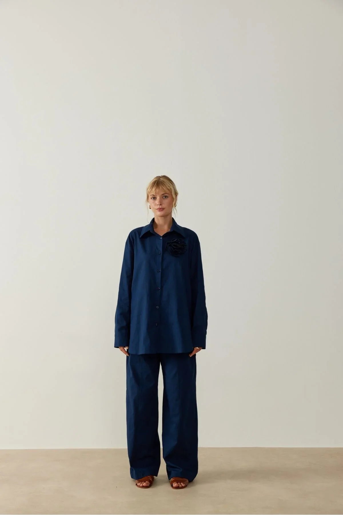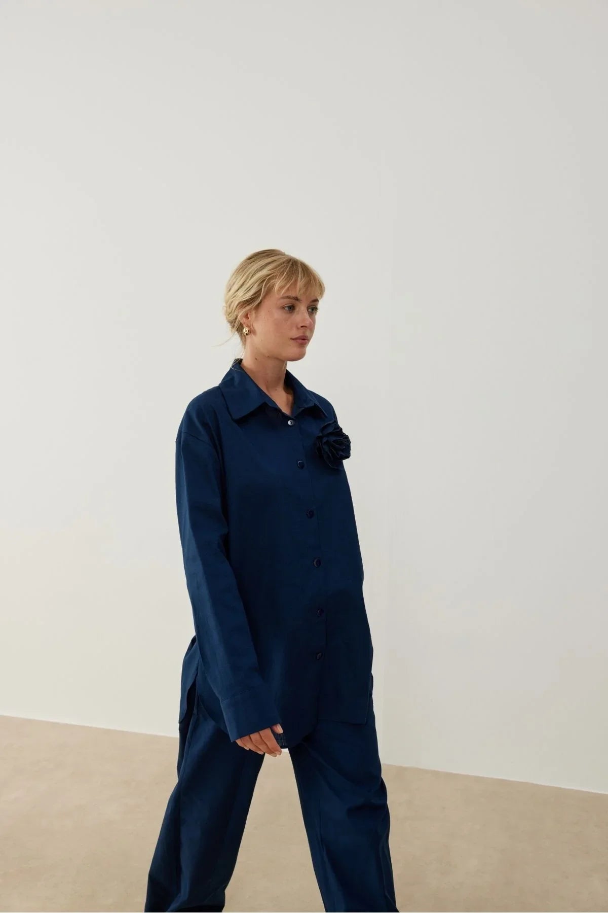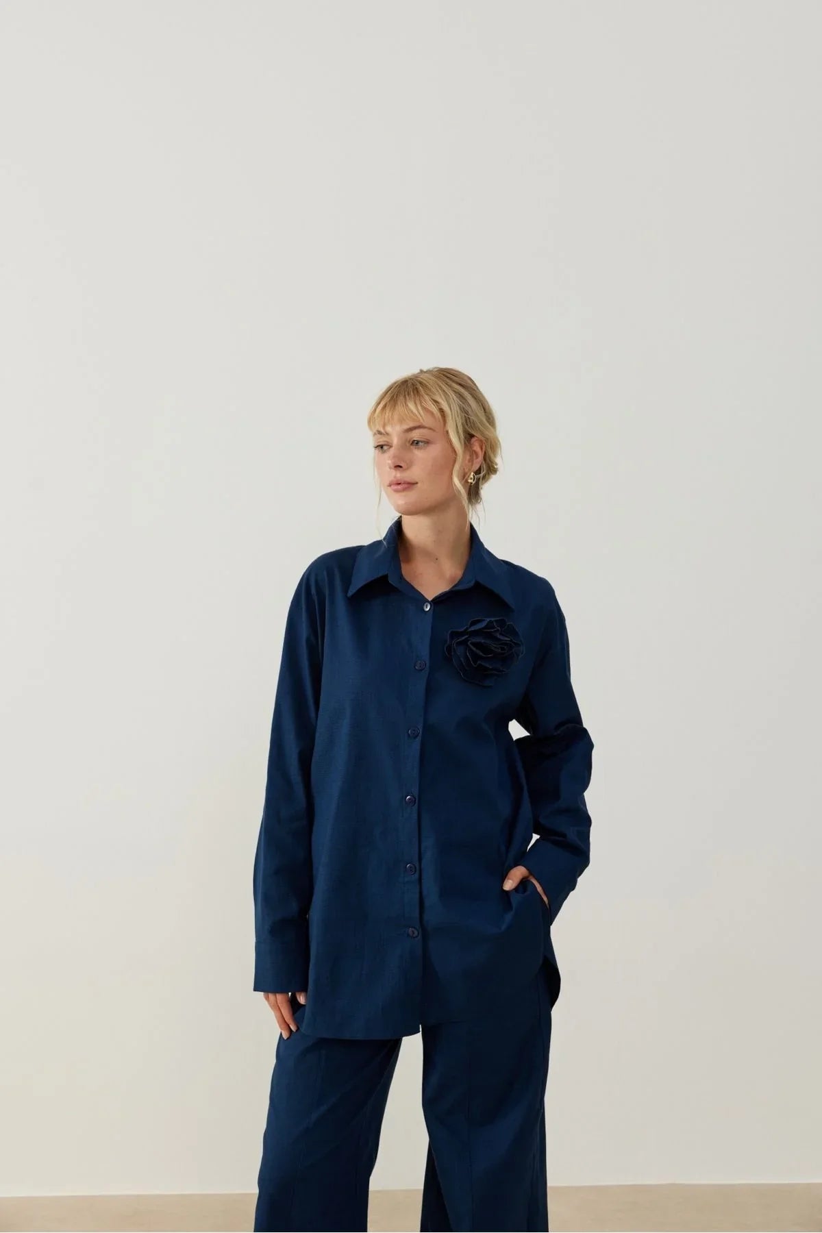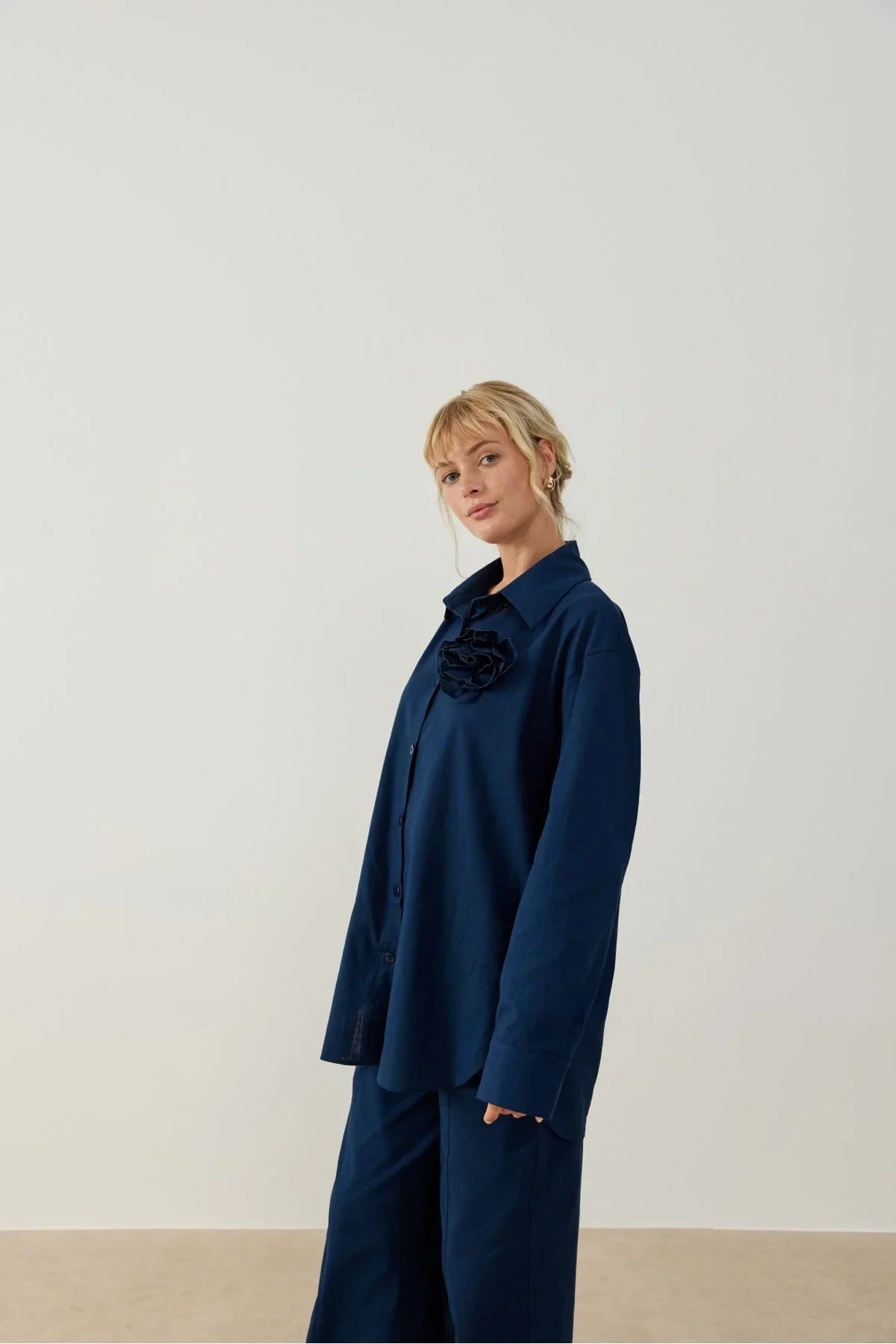 Yuti Gül Broşlu Keten Takım Lacivert